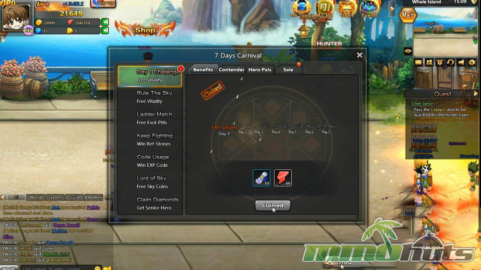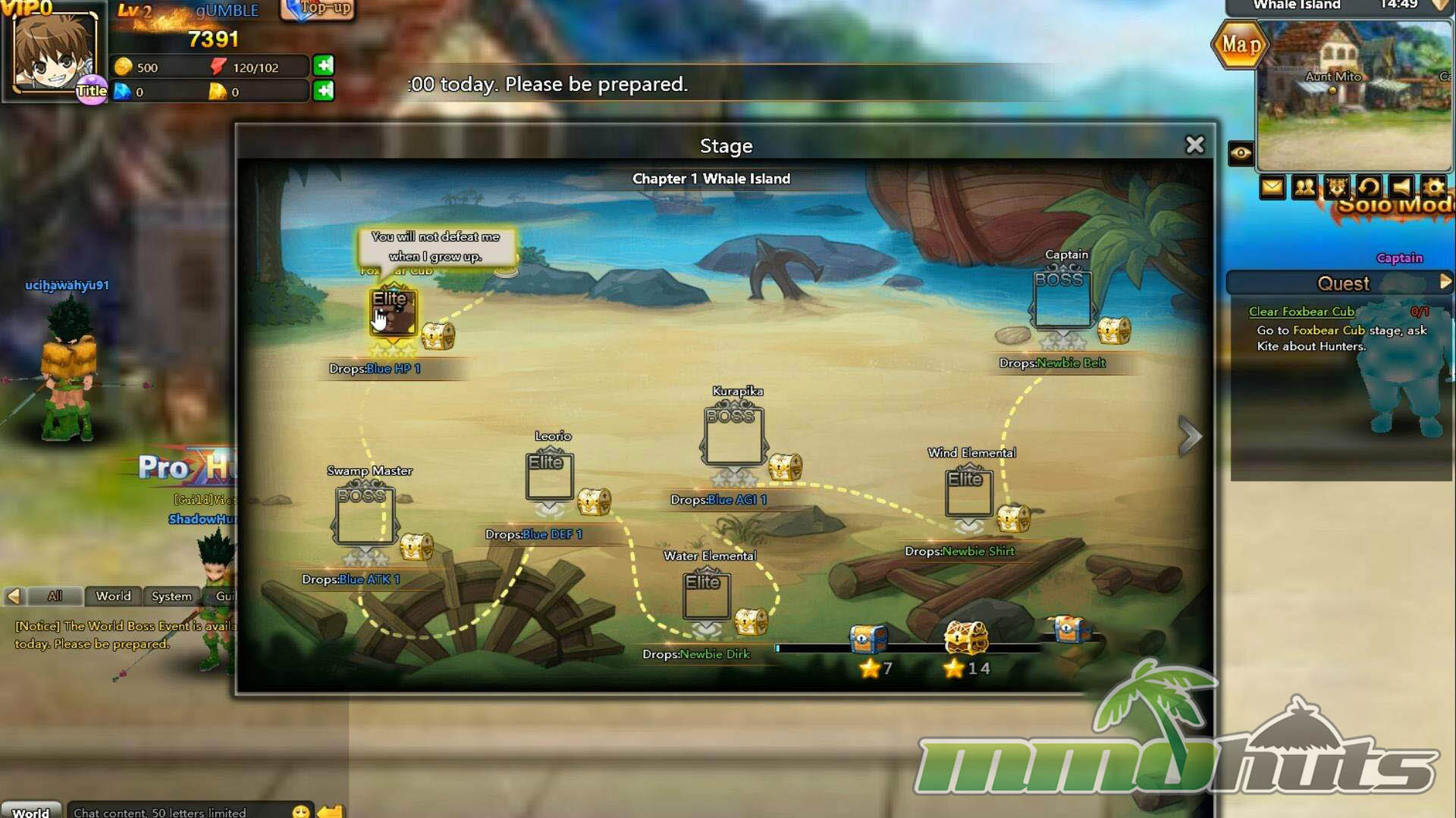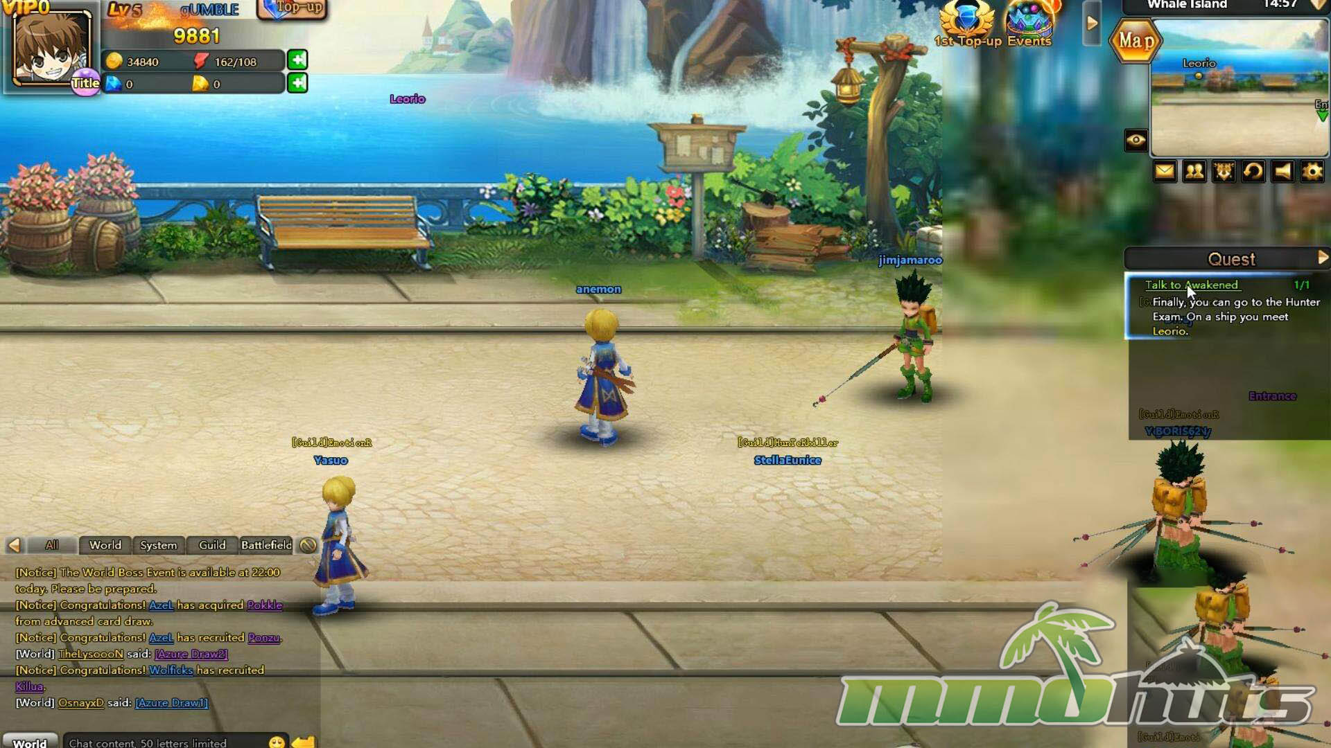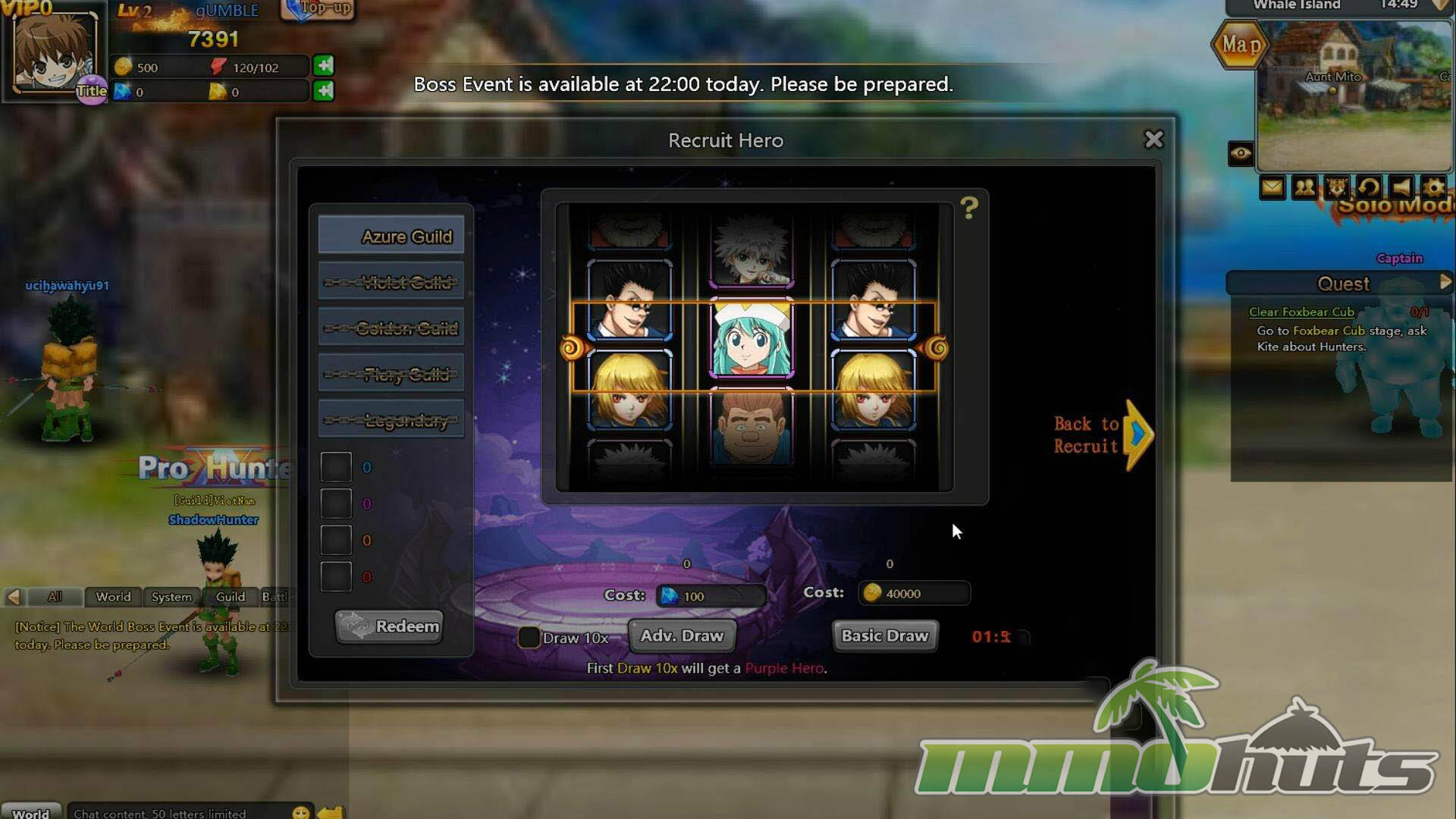 Hunter Online uses a familiar stage-by-stage browser RPG structure and places it inside the Hunter X Hunter universe. You move through the story with Gon and company as quests funnel you from one instanced fight to the next, unlocking additional chapters and systems as you go. Rather than roaming a large shared world, most playtime revolves around assembling a squad, boosting their stats, and clearing missions efficiently, making it feel more like a mission-hub RPG than a classic MMO with explorable zones.