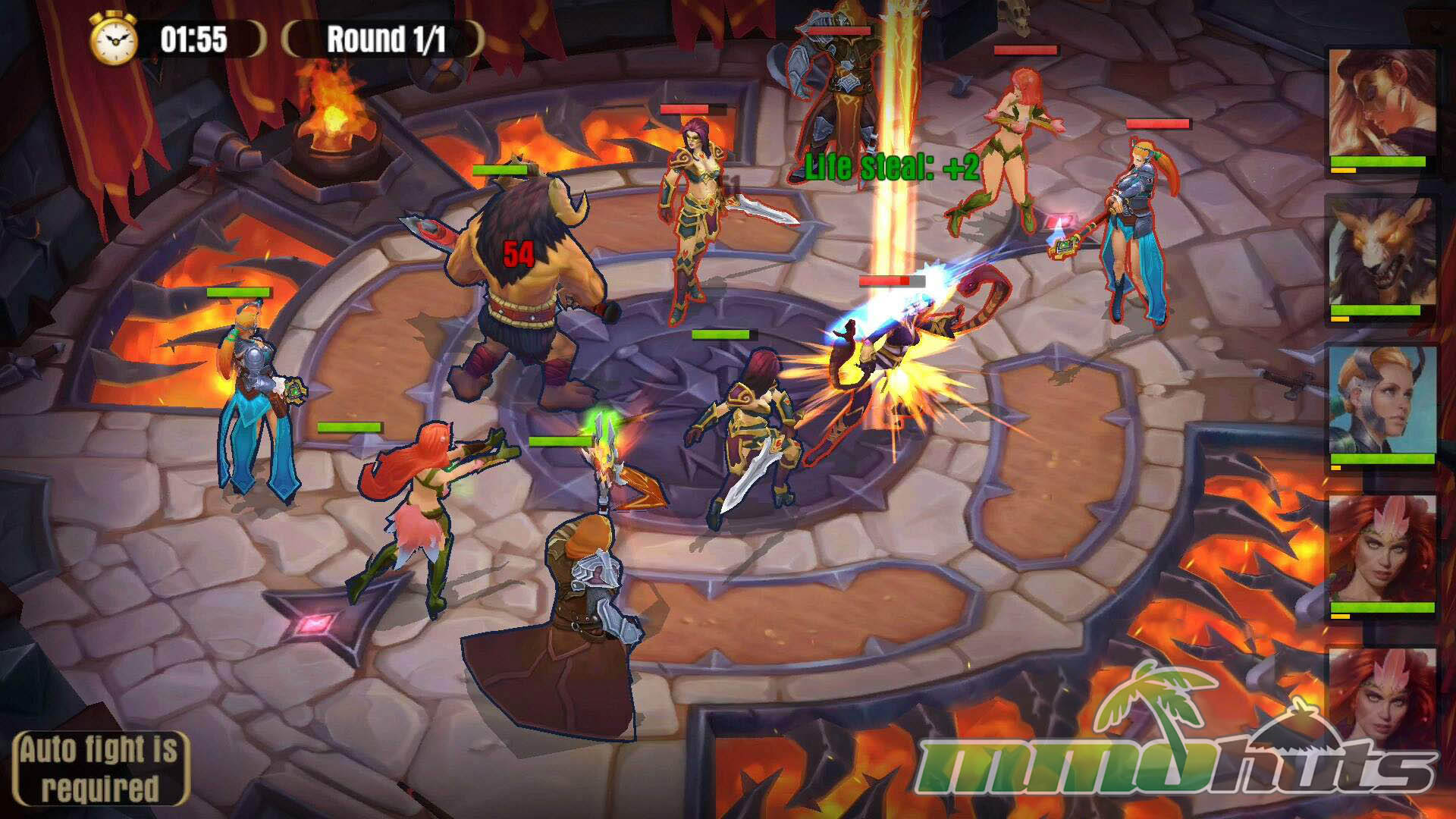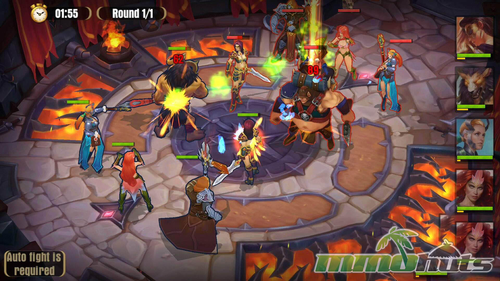The Arena is the most visible competitive mode and also the closest the game gets to player-to-player interaction. You pick from a small set of opponents around your rank and then watch the fight play out. Importantly, Arena battles are fully automated, including skill usage, which makes outcomes depend heavily on roster strength, promotions, and evolutions rather than on moment-to-moment decision-making.