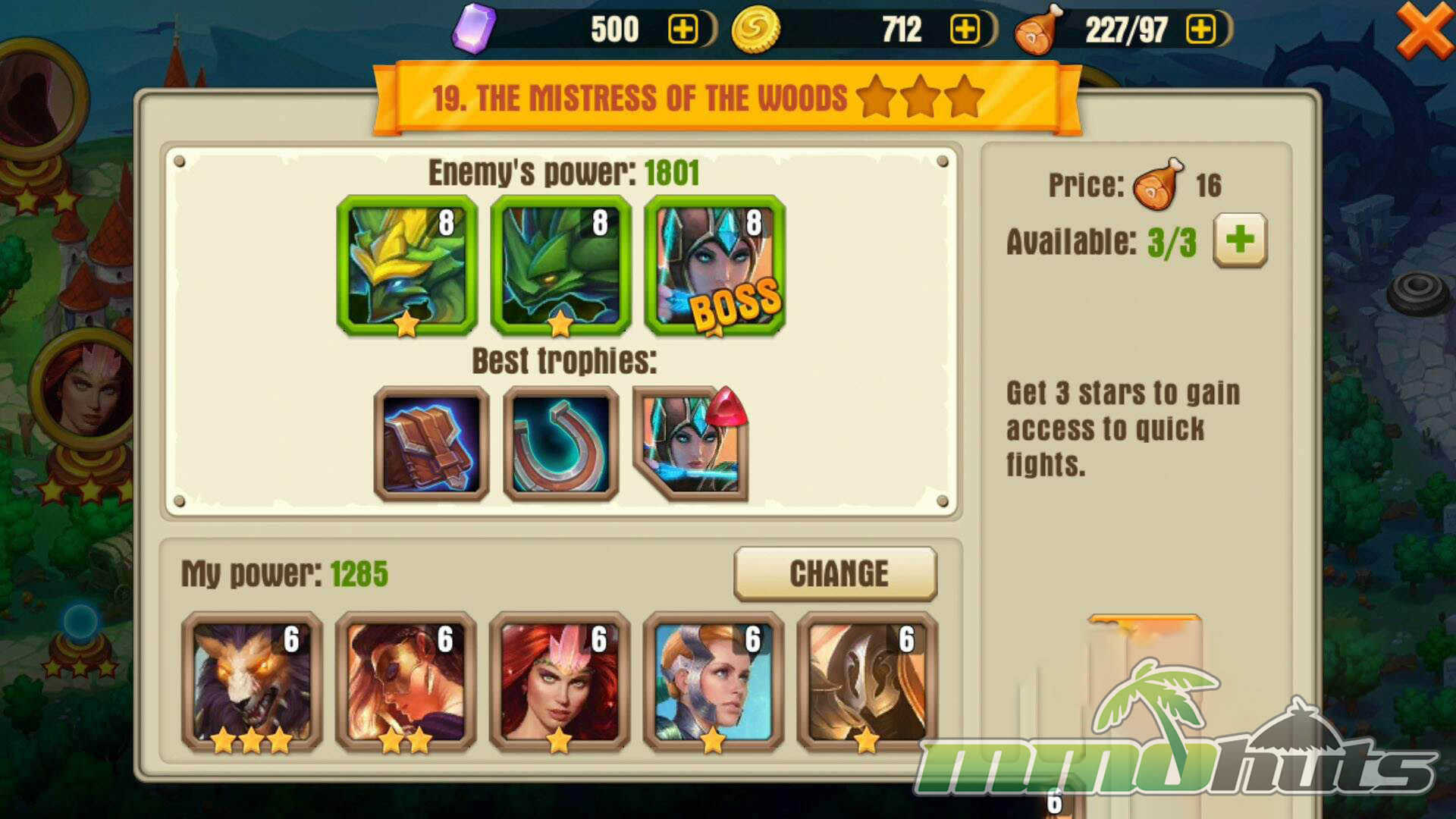 Heroes are ranked by stars (1 through 6) and are obtained by gathering enough Soulstones to assemble them. Soulstones come from specific stages and from gacha-style chests, so your progress is a mix of targeted farming and randomness. After unlocking a Hero, you strengthen them by equipping trophies (gear pieces earned from stages), promoting them once fully geared, and unlocking additional skills as they advance. Evolution also consumes more of that Hero’s Soulstones, which means the same character you worked to unlock becomes a long-term project to perfect. The system is straightforward and satisfying in the early game, but it is also time-intensive, and the grind becomes the defining feature later on.