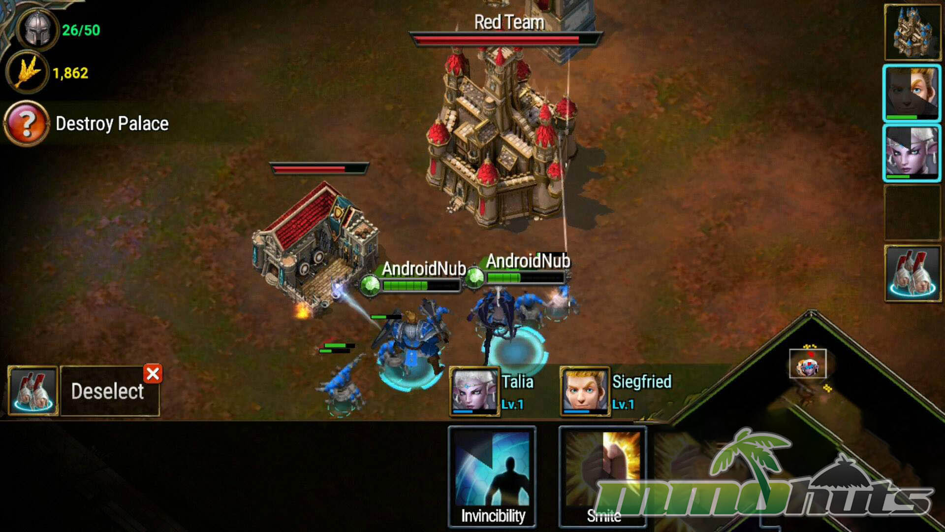 Movement and targeting are straightforward. You tap to direct Commanders, use the “All” selection to regroup quickly, and focus fire by selecting enemy units or structures. Each Commander has a unique skill you place on the battlefield, ranging from area damage and support effects to utility-style tools like repositioning or brief survivability boosts. When both sides bring multiple Commanders, fights can pivot quickly around ability timing, spacing, and whether you can catch an enemy squad out of position. As you progress, additional unit types and more advanced structures (including siege options and evolutions) widen the tactical choices.