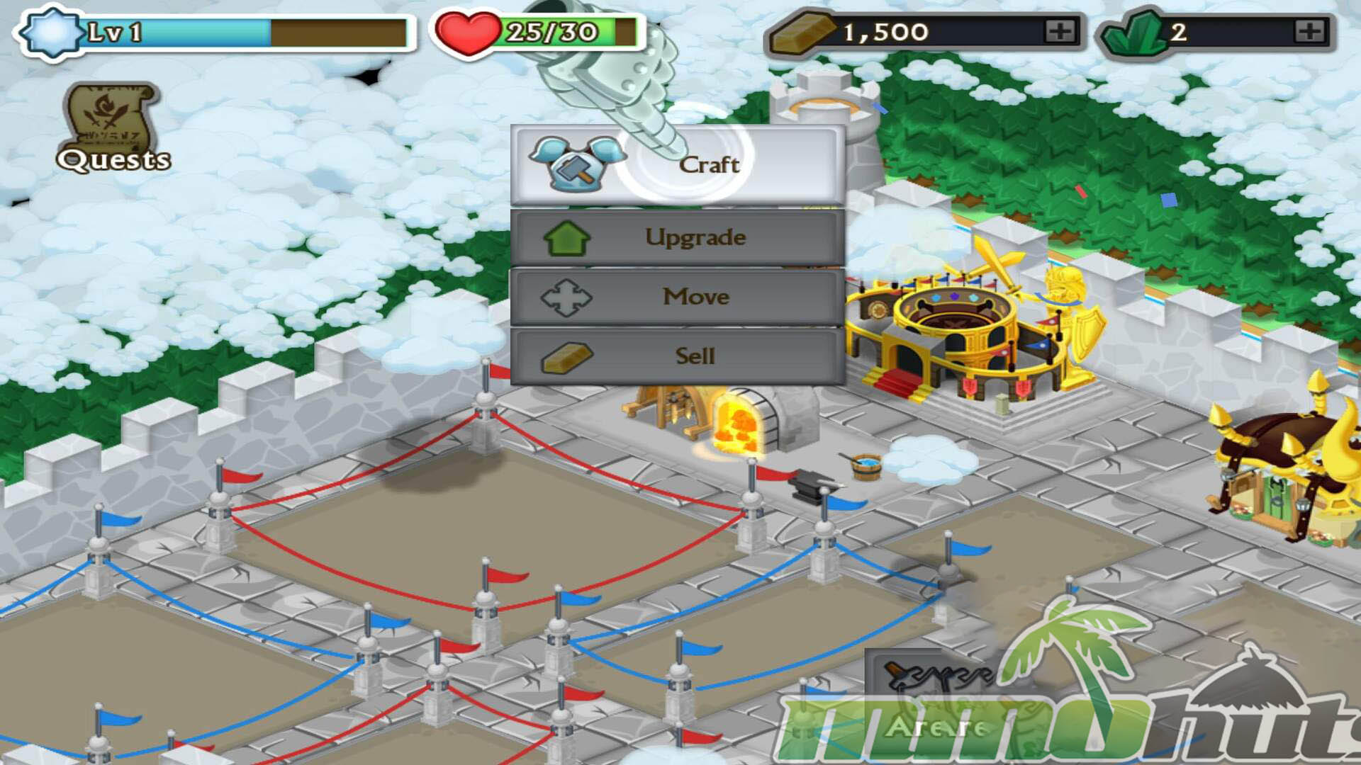 Your kingdom acts as the central hub, and it is where you place buildings that produce gold and provide key services, such as crafting through Armorsmiths. Layout customization exists, but the practical side is straightforward. Most structures primarily exist to generate gold over time, with manual collection and storage limits that encourage frequent check-ins. Upgrades increase output, but there is not much strategic depth beyond expanding and keeping production rolling.