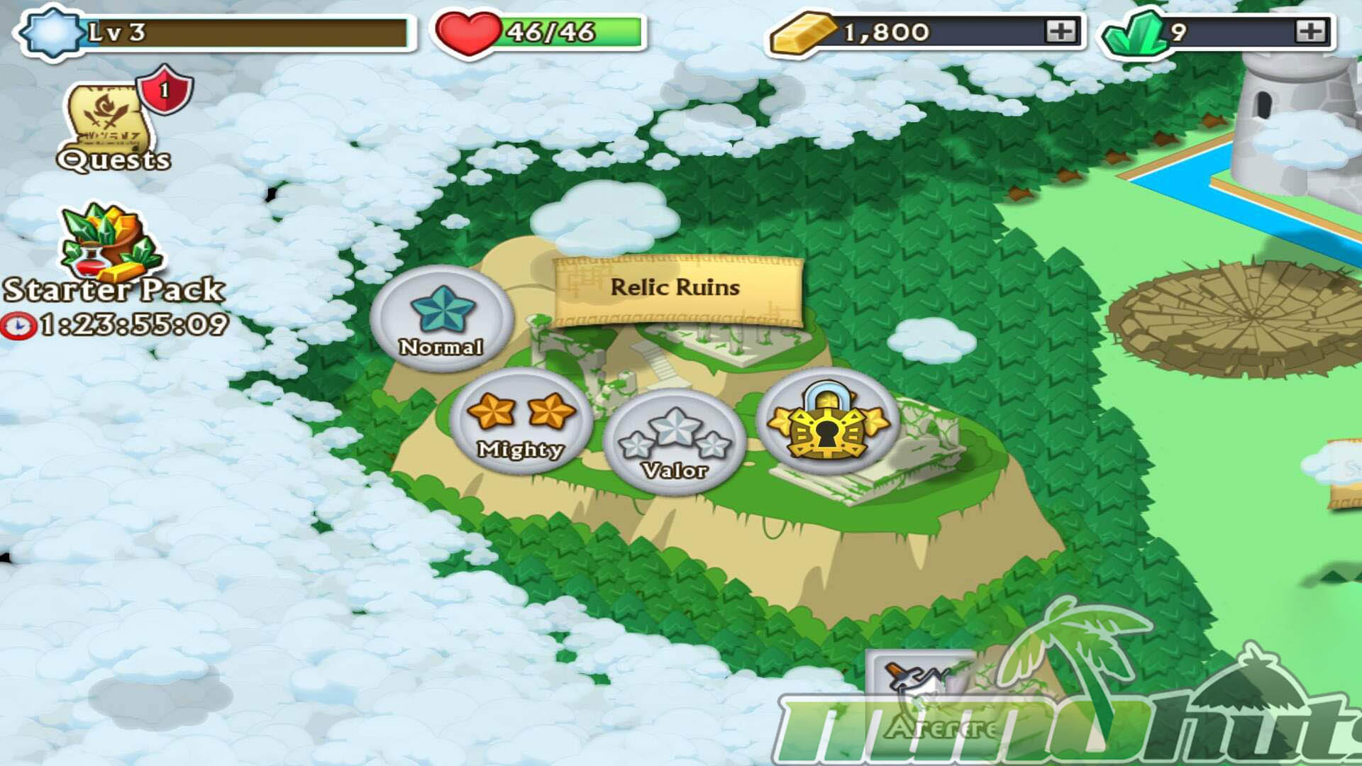 Exploration unfolds as you clear enemy hideouts around your kingdom, gradually revealing new locations. Each hideout features five difficulty tiers (Normal, Mighty, Valor, Honor, and Epic). Clearing higher tiers is important because advancing the map requires beating the prior hideout on Epic. This structure creates a predictable cadence: complete a zone across difficulties, earn materials tied to that zone’s element theme, and repeat stages as needed to farm what you are missing.
