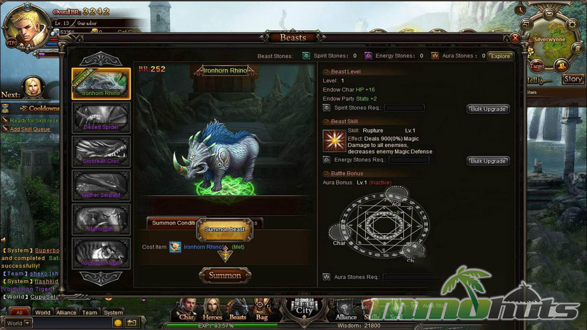 Beasts (pets) are another long-term layer, typically acquired through collecting fragments and converting them into a permanent summon. They function differently from heroes, generally building toward impactful attacks and providing buffs and stat boosts to the party. Upgrading them uses materials earned through play (and, as with many free-to-play browser MMOs, there are also premium shortcuts).