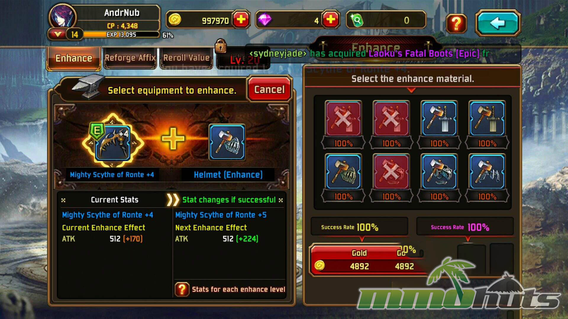 Enhancement follows a familiar mobile RPG pattern. You feed other equipment into a chosen piece to level it up and raise its stats, making it easy to focus power into a preferred weapon or armor set as you progress.