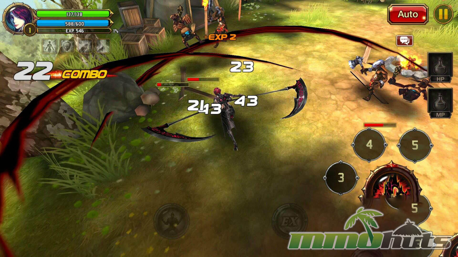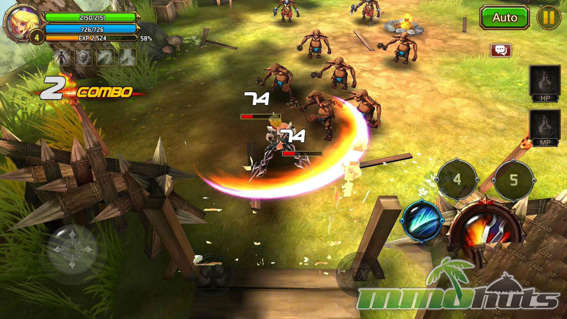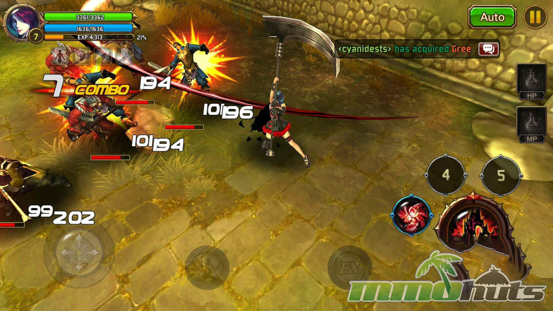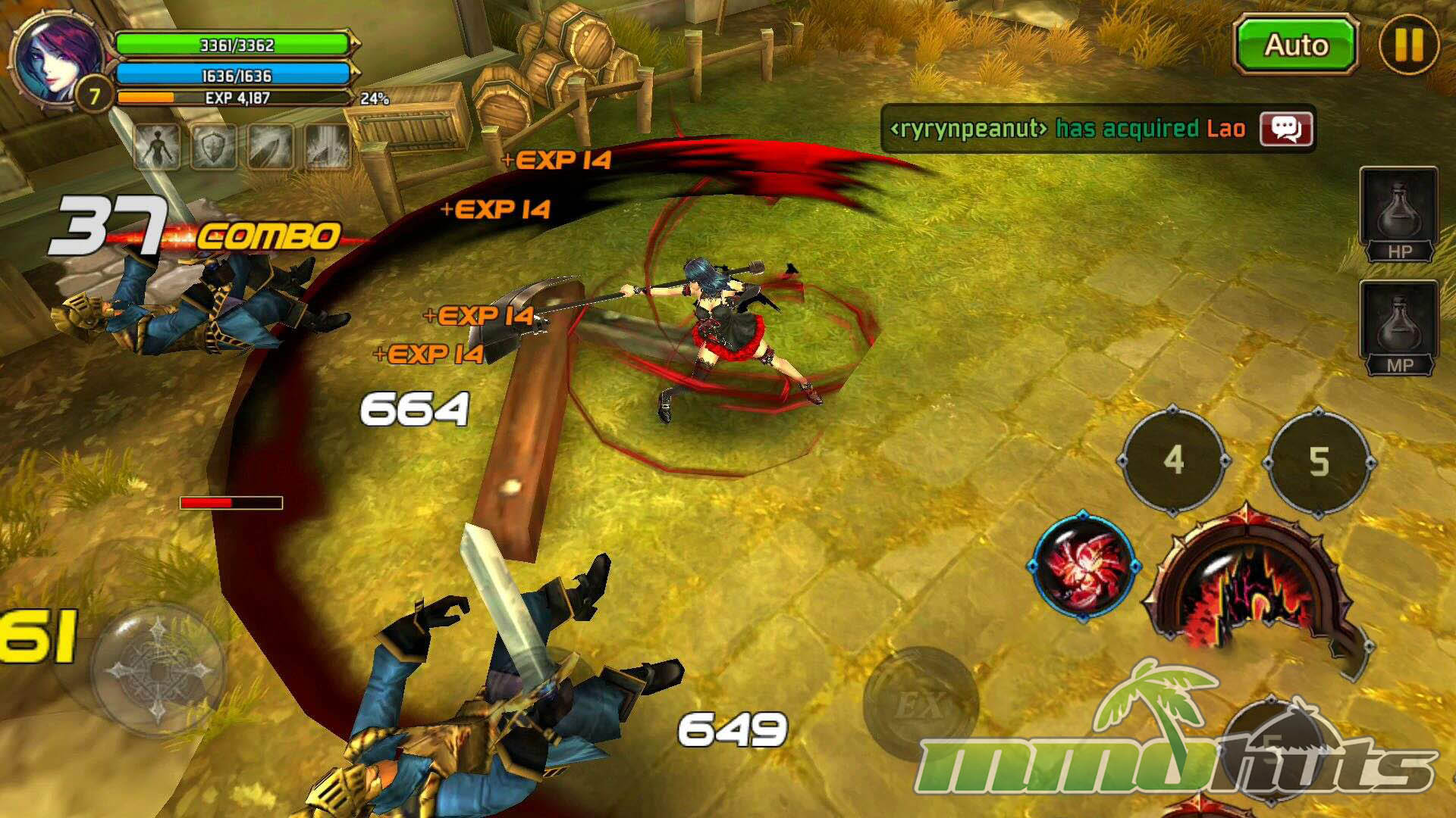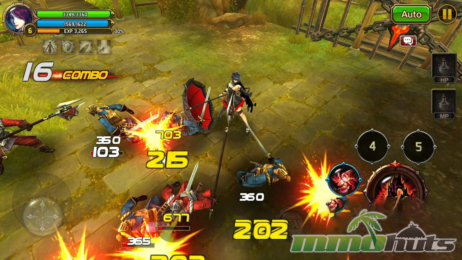 Moment-to-moment gameplay is built around quick inputs and constant pressure. Movement uses a virtual joystick, while basic attacks and skills are mapped to buttons, creating a control scheme that feels closer to an arcade brawler than a typical mobile RPG. Regular enemies are frequently knocked down or launched, and the game encourages you to chain hits into air juggles, then extend those strings with skills for bigger clears. This juggling system is a key differentiator, it adds a small but satisfying skill element that rewards timing rather than pure stat checks.