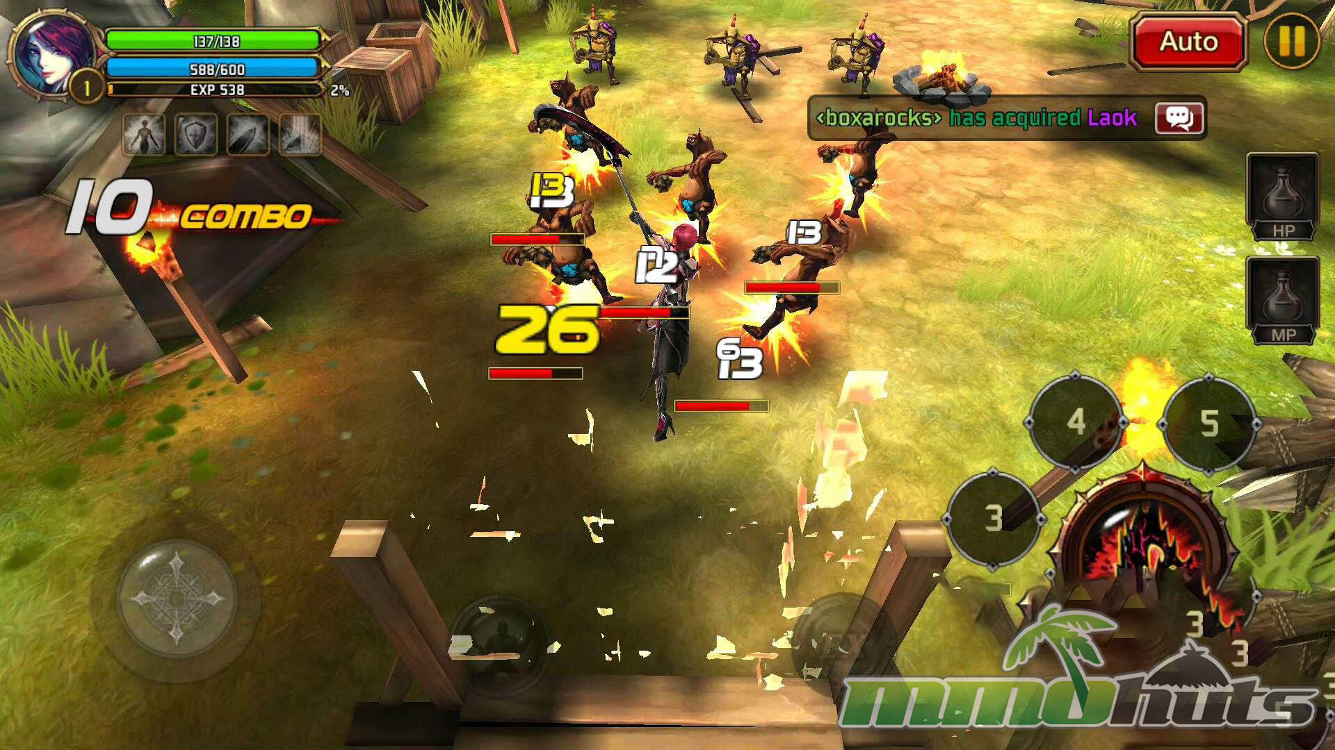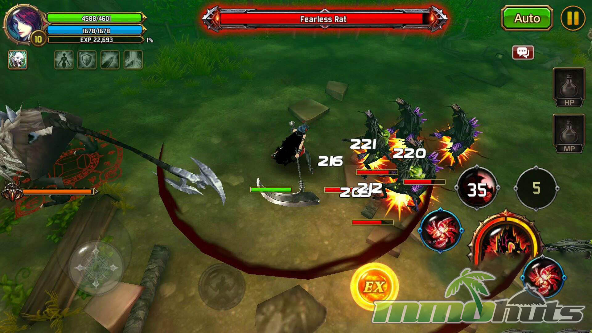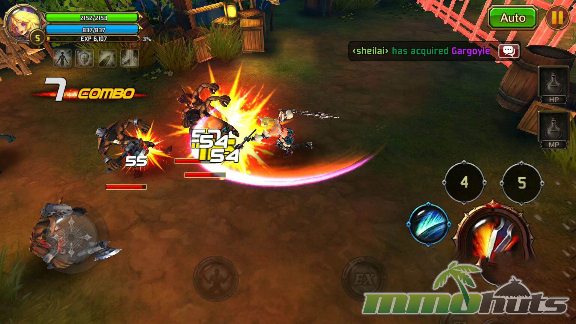 Moment-to-moment gameplay is built around quick inputs and constant pressure. Movement uses a virtual joystick, while basic attacks and skills are mapped to buttons, creating a control scheme that feels closer to an arcade brawler than a typical mobile RPG. Regular enemies are frequently knocked down or launched, and the game encourages you to chain hits into air juggles, then extend those strings with skills for bigger clears. This juggling system is a key differentiator, it adds a small but satisfying skill element that rewards timing rather than pure stat checks.