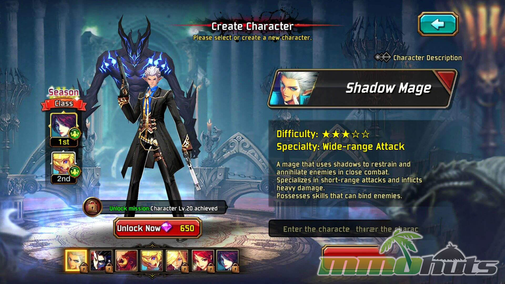 The advanced lineup opens up later (level 15 or 20 depending on the class) unless you spend Karats to access them earlier. Shadow Mage stands out as a dedicated ranged option with dual pistols and control tools that can lock enemies down. The remaining advanced classes echo the starter archetypes while shifting pace and emphasis. Demon Blade is a more agile, dual-blade take on the Berserker concept, designed to stay on the front foot with faster melee pressure. Crimson Assassin builds on the Acrobat style with strong mobility and boss-oriented burst, often defined by shorter cooldowns and constant repositioning. Dark Valkyrie mirrors the Blood Demon theme as a scythe fighter with long-reaching attacks and a kit that balances offense with sturdier defensive play.