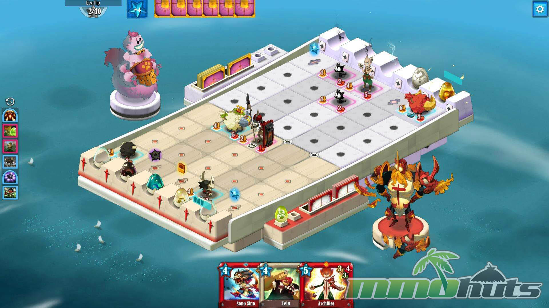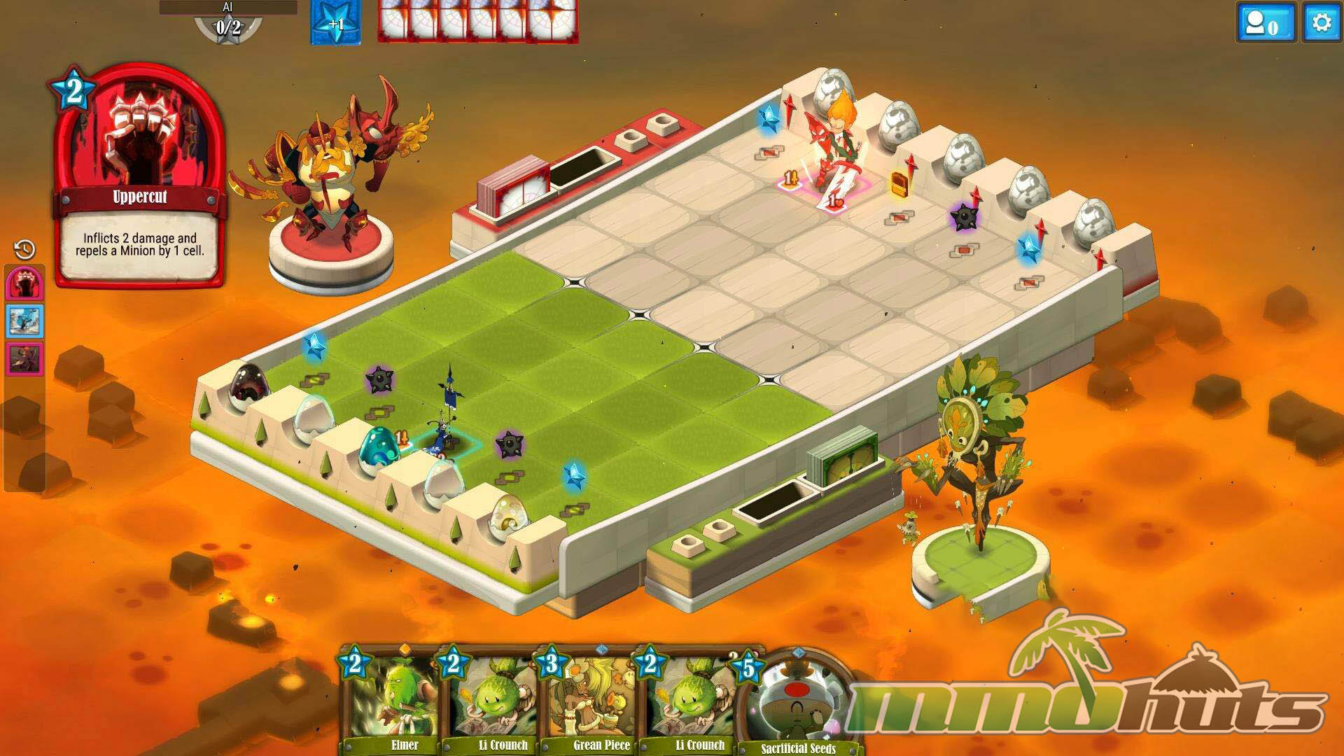 Your objective is straightforward: push units forward until they reach and destroy the enemy’s egg-shaped Dofus towers. Of course, your opponent is trying to do the same, so every turn becomes a decision about whether to commit to offense, stall a lane, or trade efficiently to keep your own Dofus safe. Because minions physically advance across the field, Krosmaga often feels closer to a light tactics game than a traditional card duel.