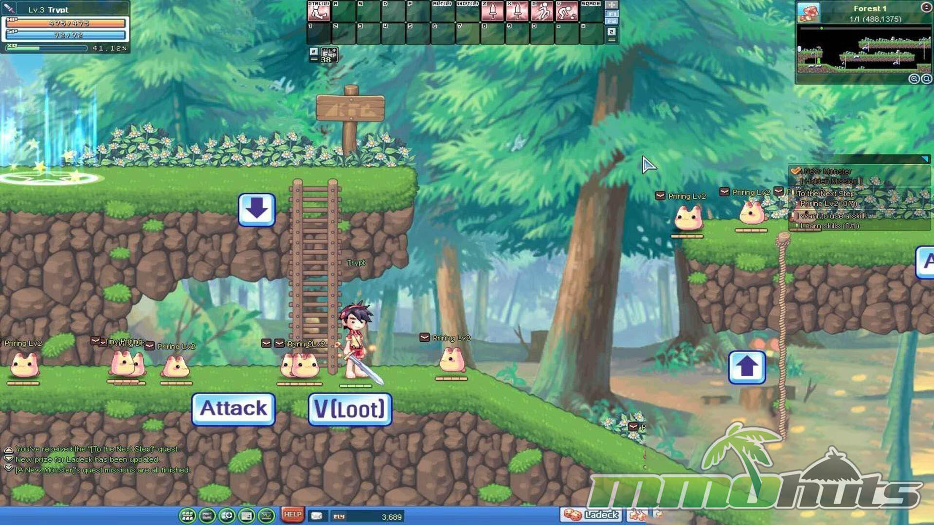 The opening hours include a guided tutorial that explains movement, combat, and basic interaction. Controls are keyboard-driven (arrow keys for movement, keys like Z and X for attacks, and additional hotkeys for skills and utility). The platformer foundations show up in small but important ways, including double jumps and using ropes to traverse gaps, which gives maps a bit of vertical texture compared to many older MMOs.