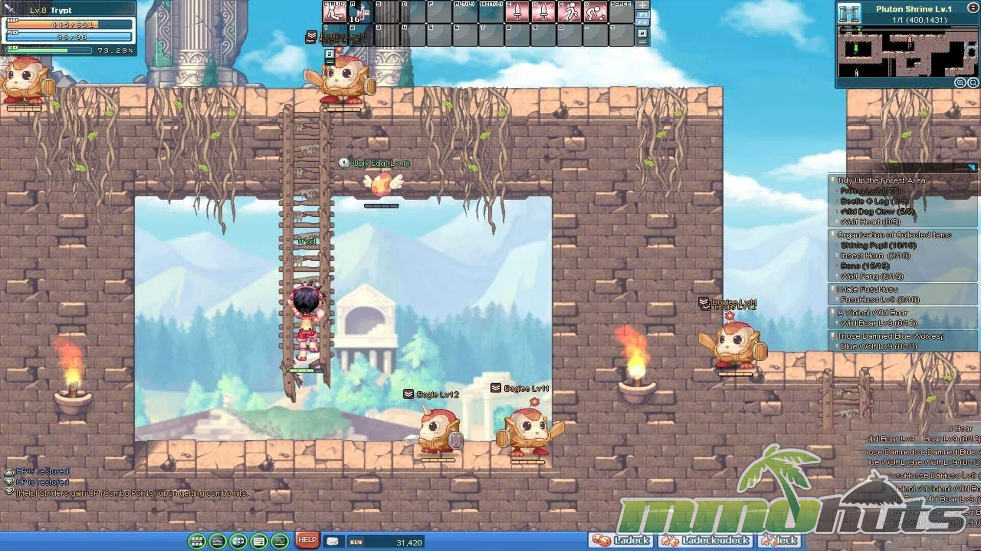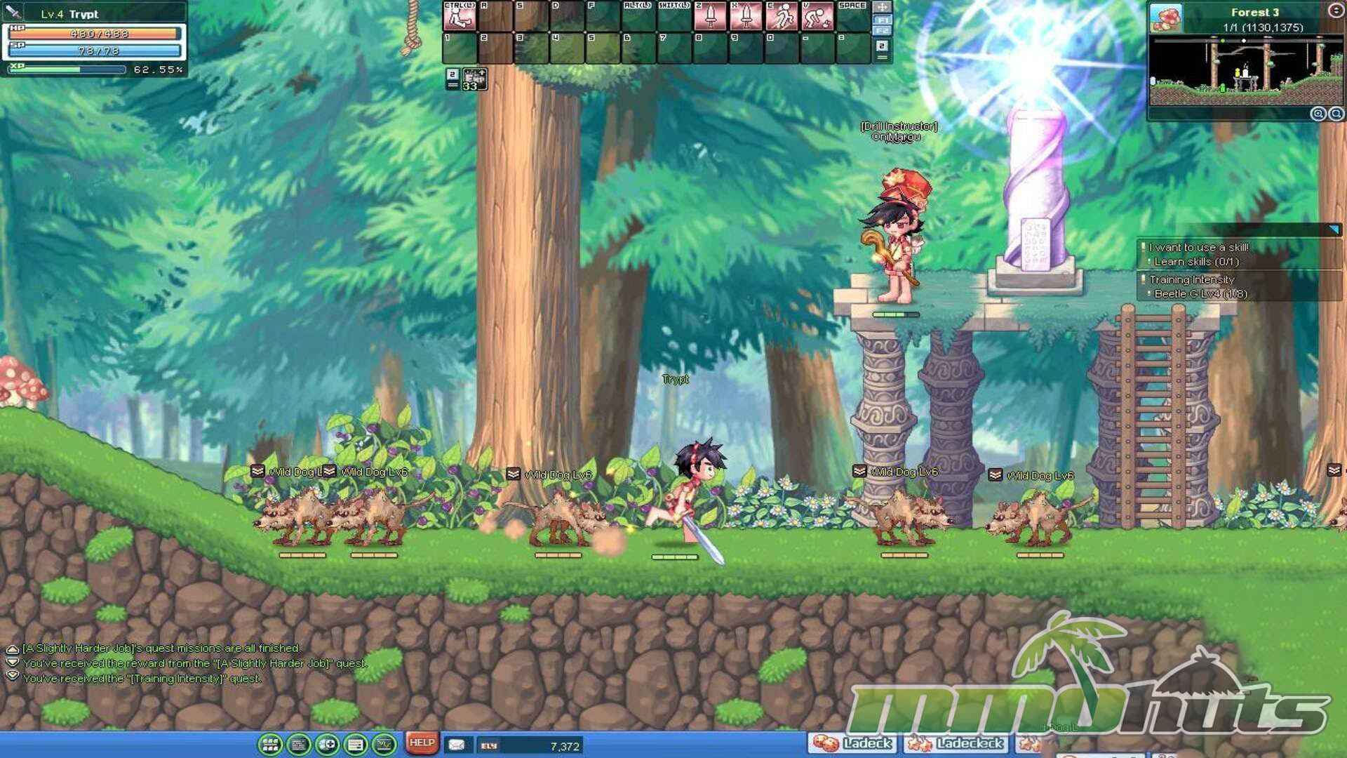 The opening hours include a guided tutorial that explains movement, combat, and basic interaction. Controls are keyboard-driven (arrow keys for movement, keys like Z and X for attacks, and additional hotkeys for skills and utility). The platformer foundations show up in small but important ways, including double jumps and using ropes to traverse gaps, which gives maps a bit of vertical texture compared to many older MMOs.