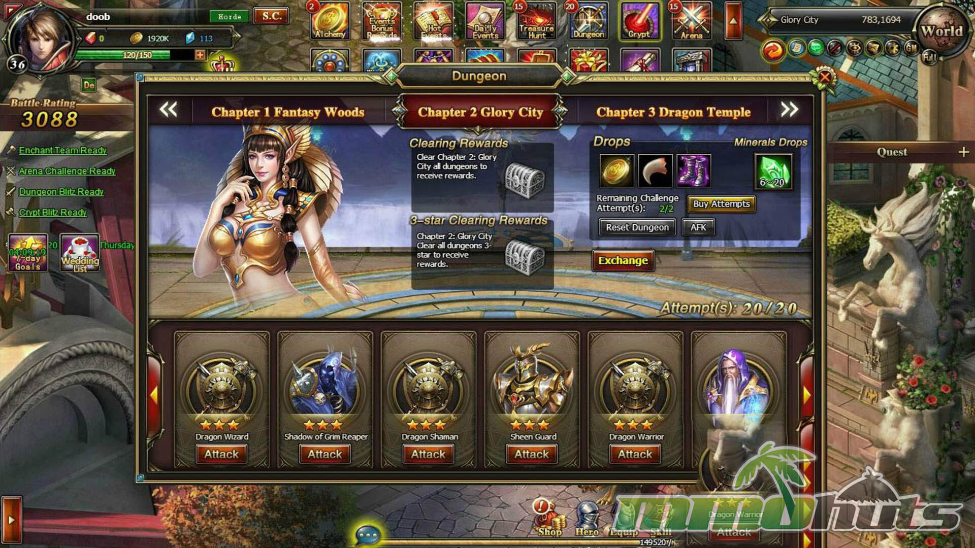 Dungeon rewards include Minerals, a currency you can exchange for equipment and upgrade-related items. It is a familiar treadmill, but it gives dungeons a distinct purpose compared to regular questing, and encourages replay for better ratings and better pulls.