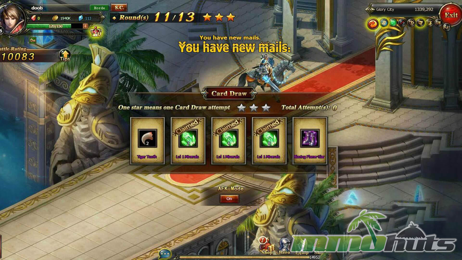 PvE endgame variety comes from dungeons tied to the world’s five continents, each gated by level requirements. As you level, you unlock stronger boss stages, and each clear is scored with the same star rating structure used elsewhere. The reward format here adds a bit of flavor, higher star ratings grant more draws from a card selection, and those cards determine what you receive.