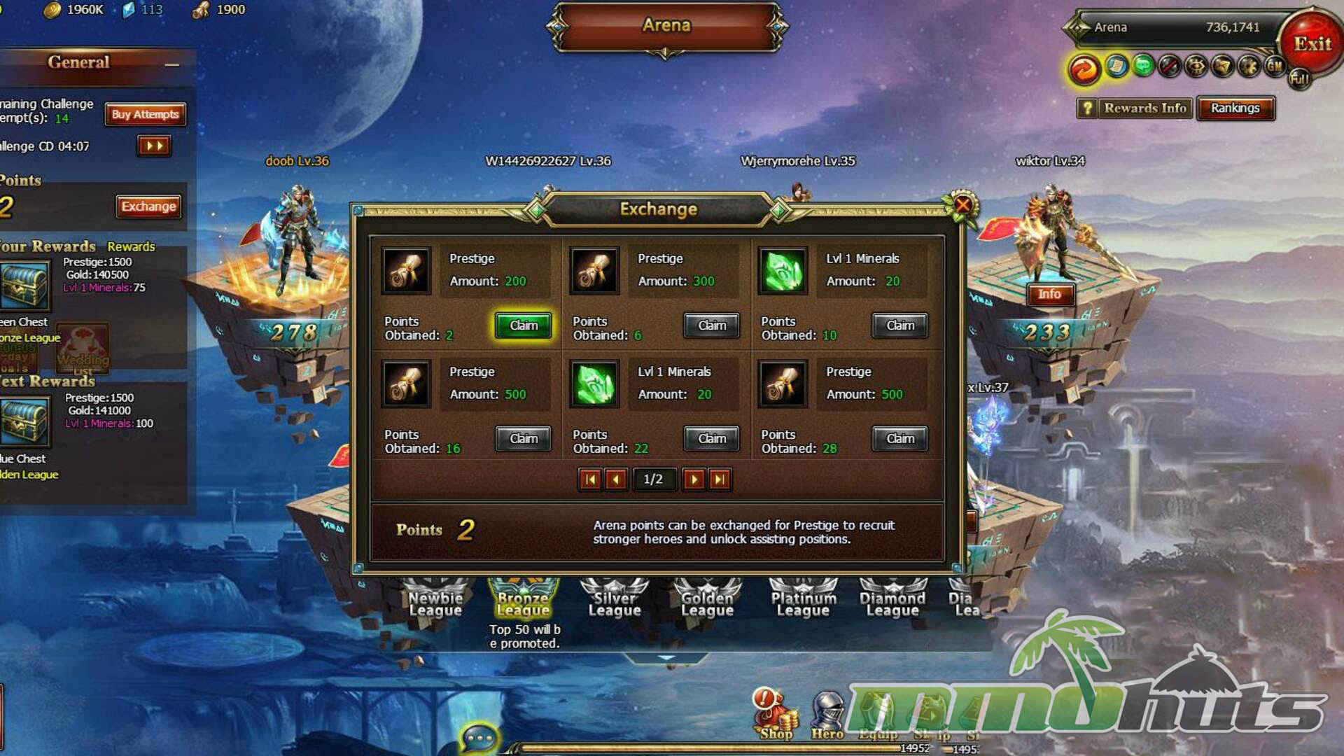For PvP, Legend Knight uses party-versus-party arena battles that determine rank. Wins provide a mix of Minerals, Prestige, and Gold, and higher placement improves your overall payout. The PvP itself follows the same underlying structure as PvE combat, so success is largely about roster strength, formation choices, and progression advantages rather than mechanical outplay.