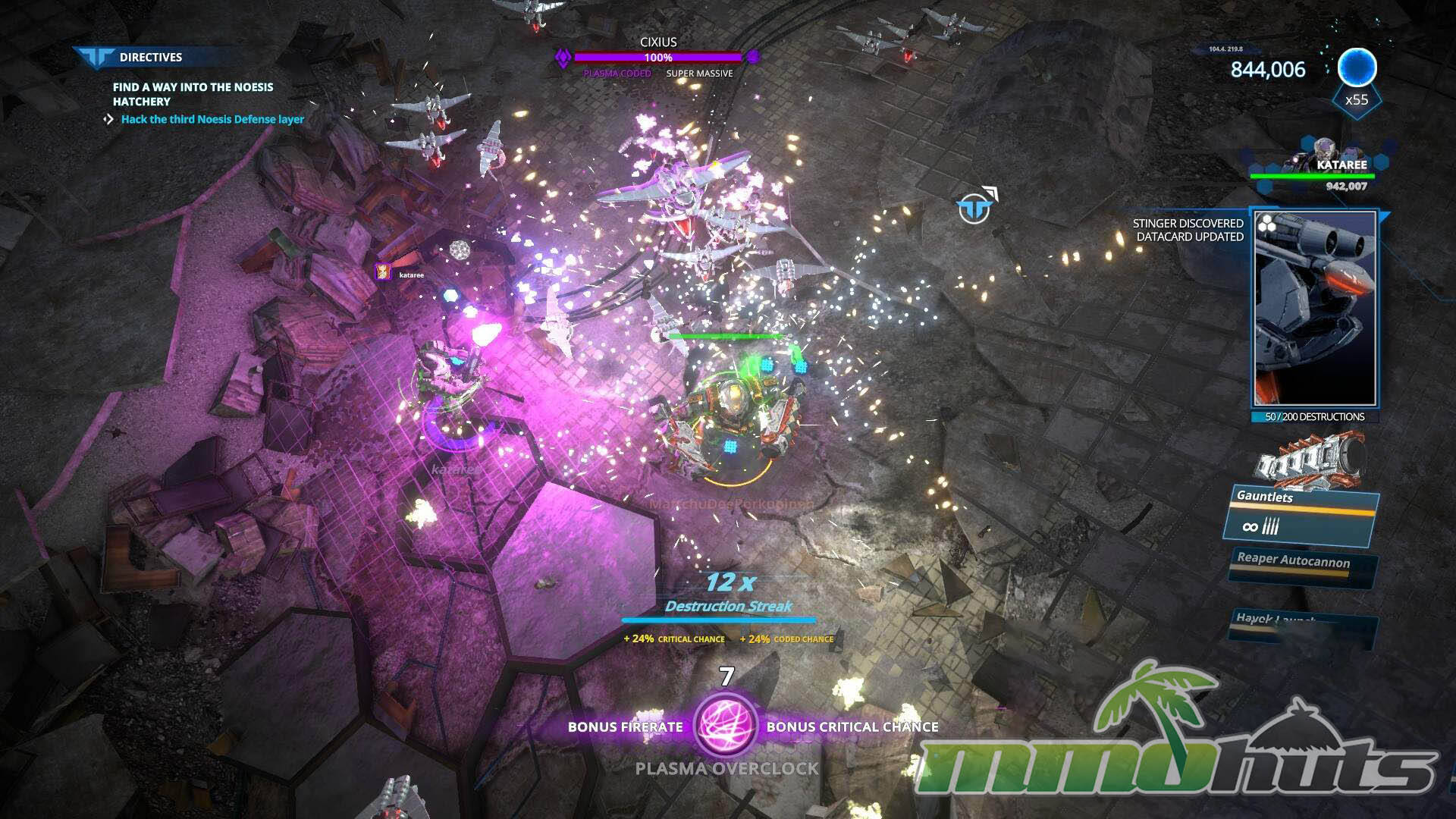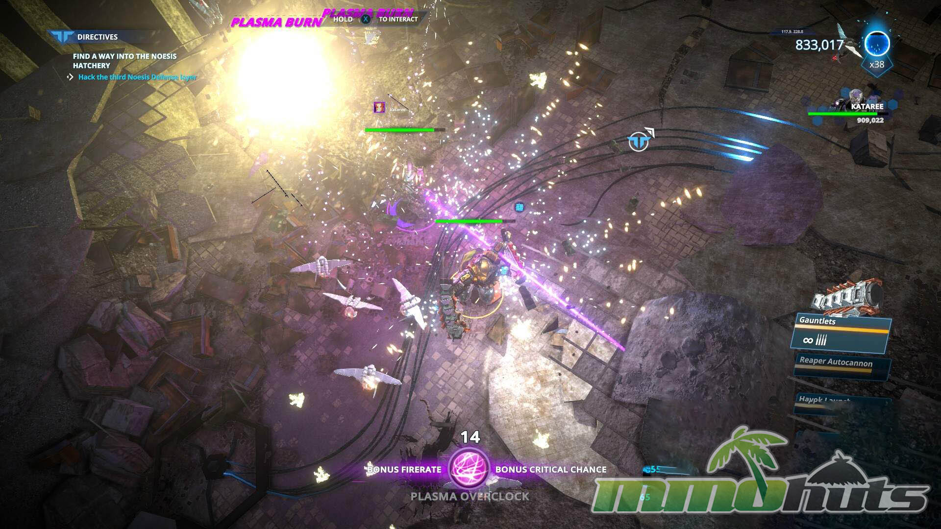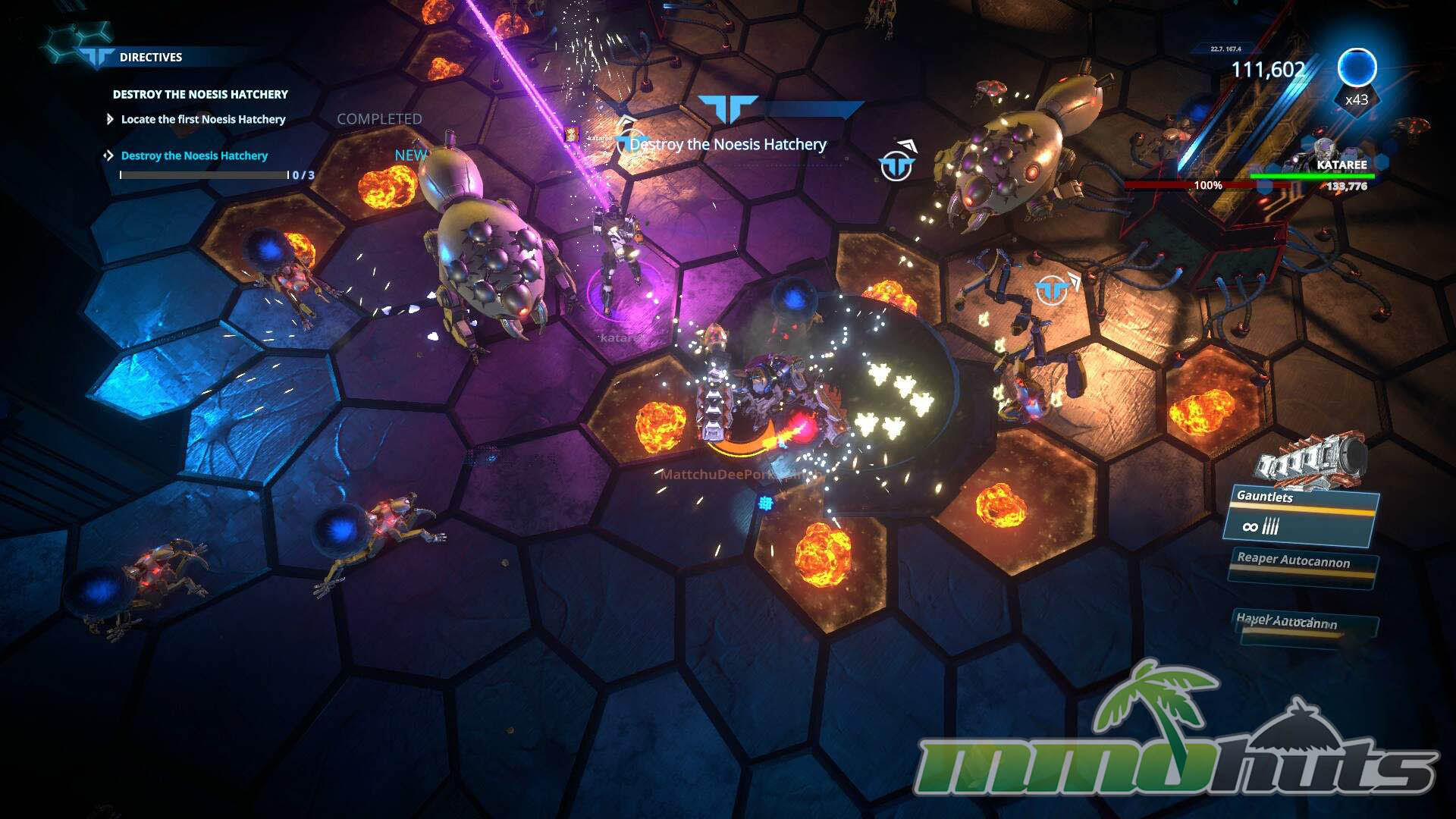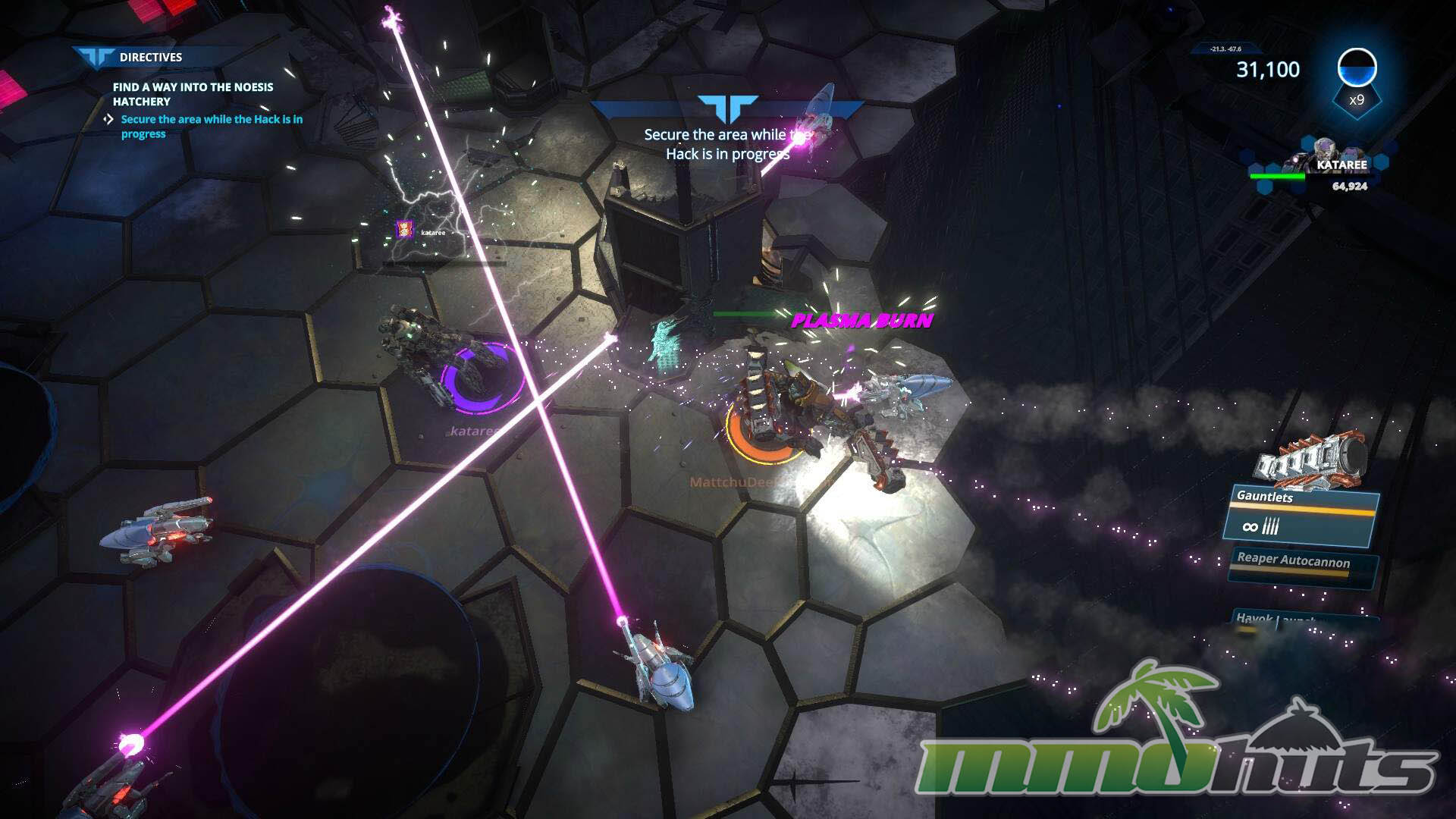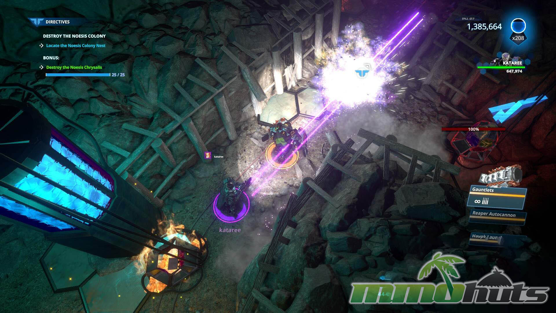 Once you deploy, the campaign structure mixes a handful of mission types across mostly linear spaces. Some stages push you forward through objectives, others revolve around holding a node against waves, and a few combine tasks with repeated boss pressure over the course of a level. There are also occasional environmental wrinkles that make certain arenas stand out, even if the general flow remains focused on clearing enemies efficiently.