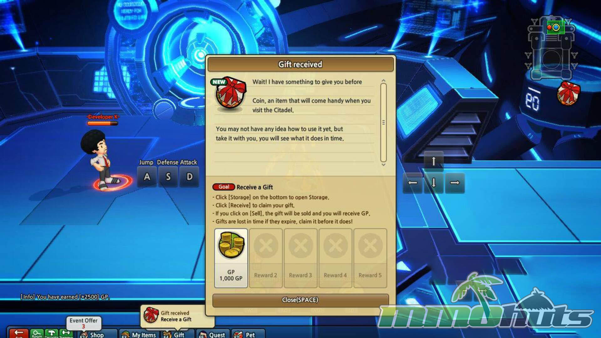 New players are pushed through a short tutorial hosted by an NPC called Developer K. It covers movement, basic attacks, defense, and skill inputs, and it cannot be skipped. After that, Developer K continues to appear with starter quests designed to funnel you into different menus and modes, while handing out GP (the main currency) and beginner hero scrolls that provide temporary access to additional Heroes.