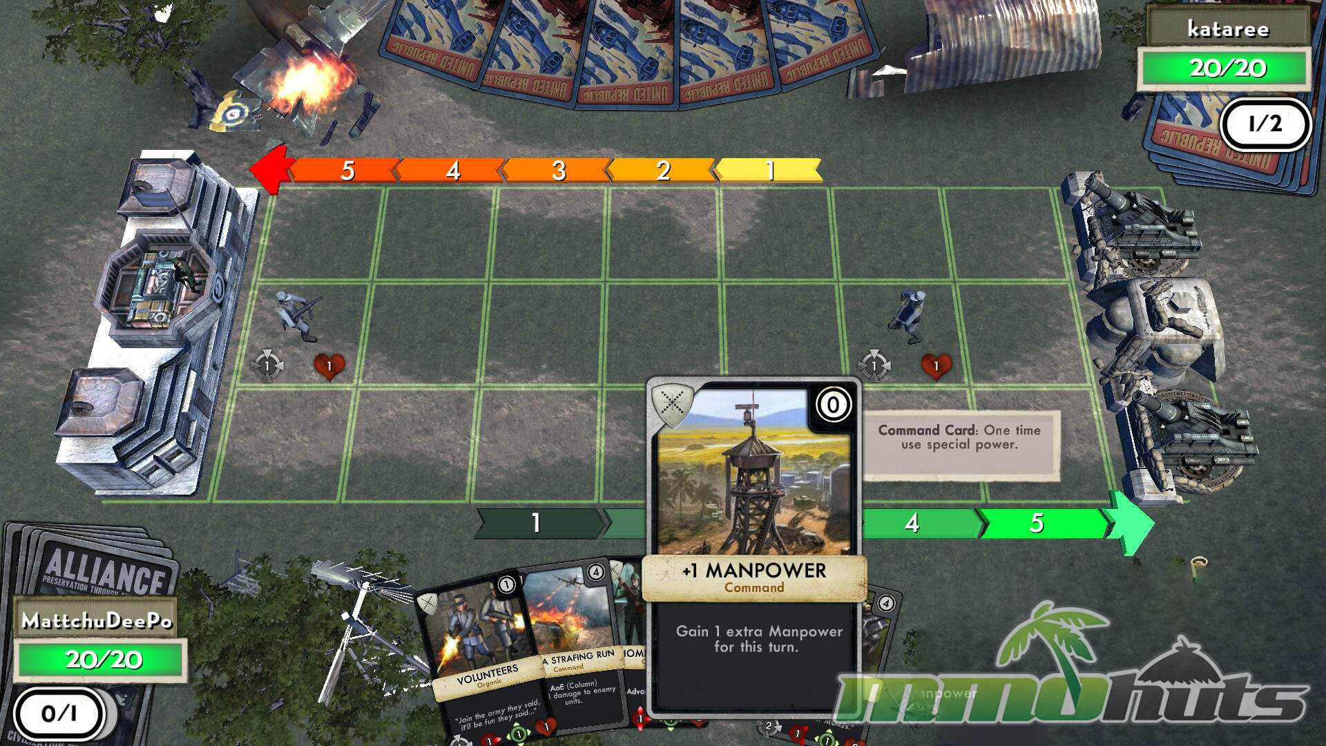 Your hand sits along the bottom, deck information is a hover away, and the resource system is a close cousin of “mana” from other card battlers, here renamed to Manpower. You ramp up by one Manpower per turn to a cap of 12, which creates a familiar cadence of early skirmish units into late-game power plays. The second player also receives a one-turn resource boost card, a common solution for tempo disadvantage that works well in a game where initiative can snowball.