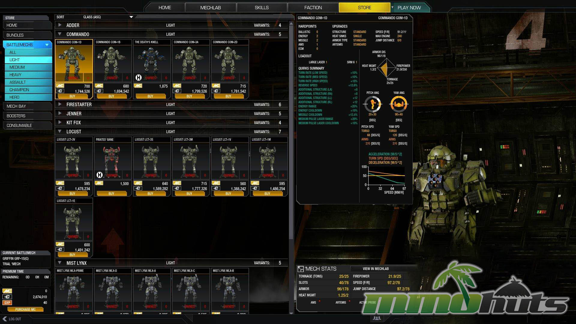 After a handful of matches you can start affording your first purchases, and the hangar opens up in a big way. The store and loadout screens are dense, and the interface can feel technical, but the upside is real freedom. Once you own a mech, you are not locked into a simple “primary and secondary” setup. You can tune the machine around a preferred engagement range, mix weapon types, and adjust supporting components to suit your plan.