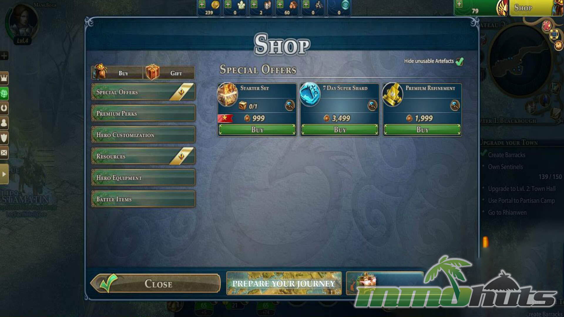 MMHO included a typical free-to-play shop selling convenience and progression items, including equipment, potions, gold, and Hero Seals. Hero Seals were used for features like additional character slots, reviving fallen units, scouting enemy forces, and other utility functions. As with many F2P strategy games, spending could speed up progress and smooth out friction points, and it could translate into competitive advantages in certain contexts.