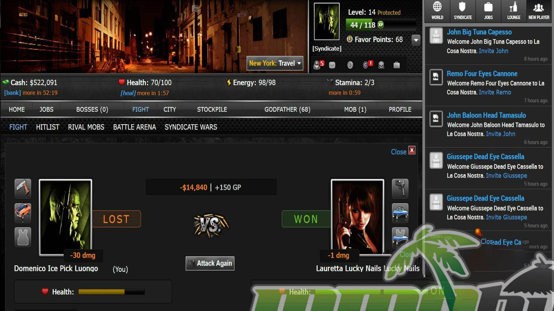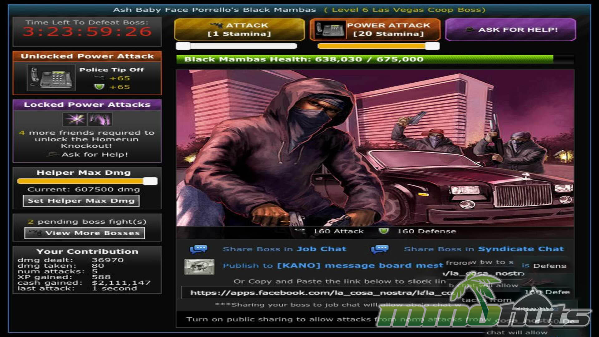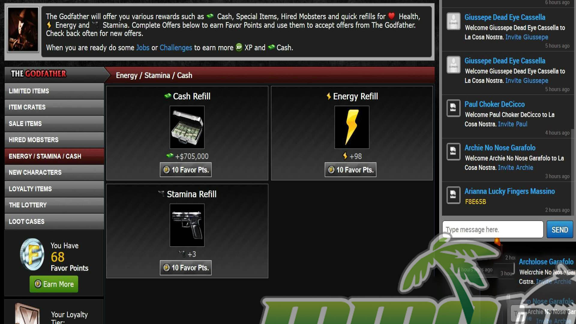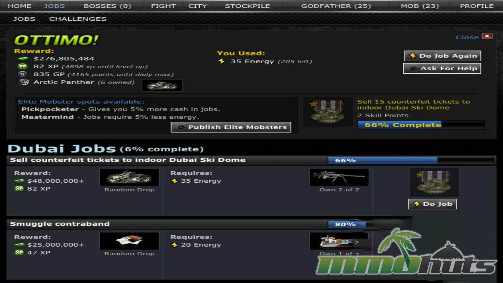 Mob Wars: La Cosa Nostra is built around a classic social RPG loop: spend energy to run jobs, get paid, improve your loadout, then repeat with bigger numbers and higher stakes. It is an intentionally lightweight experience, designed for quick check-ins, and it succeeds best when approached as a long-running routine rather than a narrative-driven RPG.