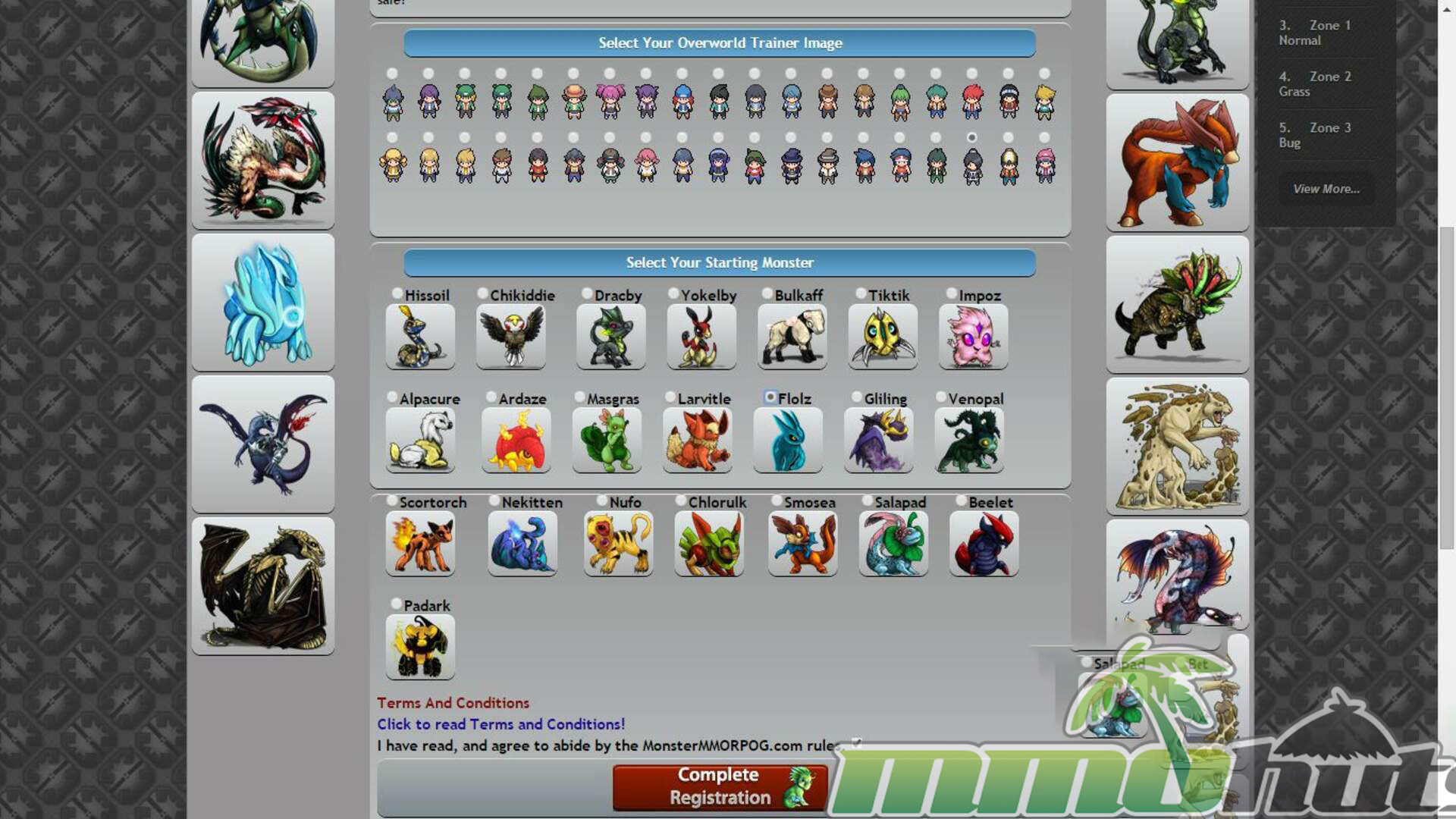 Your first decisions happen before you even enter the world. Instead of an opening sequence that slowly introduces your trainer and starter, character selection and starter choice are handled during account registration. You can pick from a range of pre-made character looks and choose a starting monster from a surprisingly broad set for a starter list, with different types, natures, and abilities available right away. It is a straightforward process, and once the account is created you log in and begin in the starting area with your initial team ready to battle.