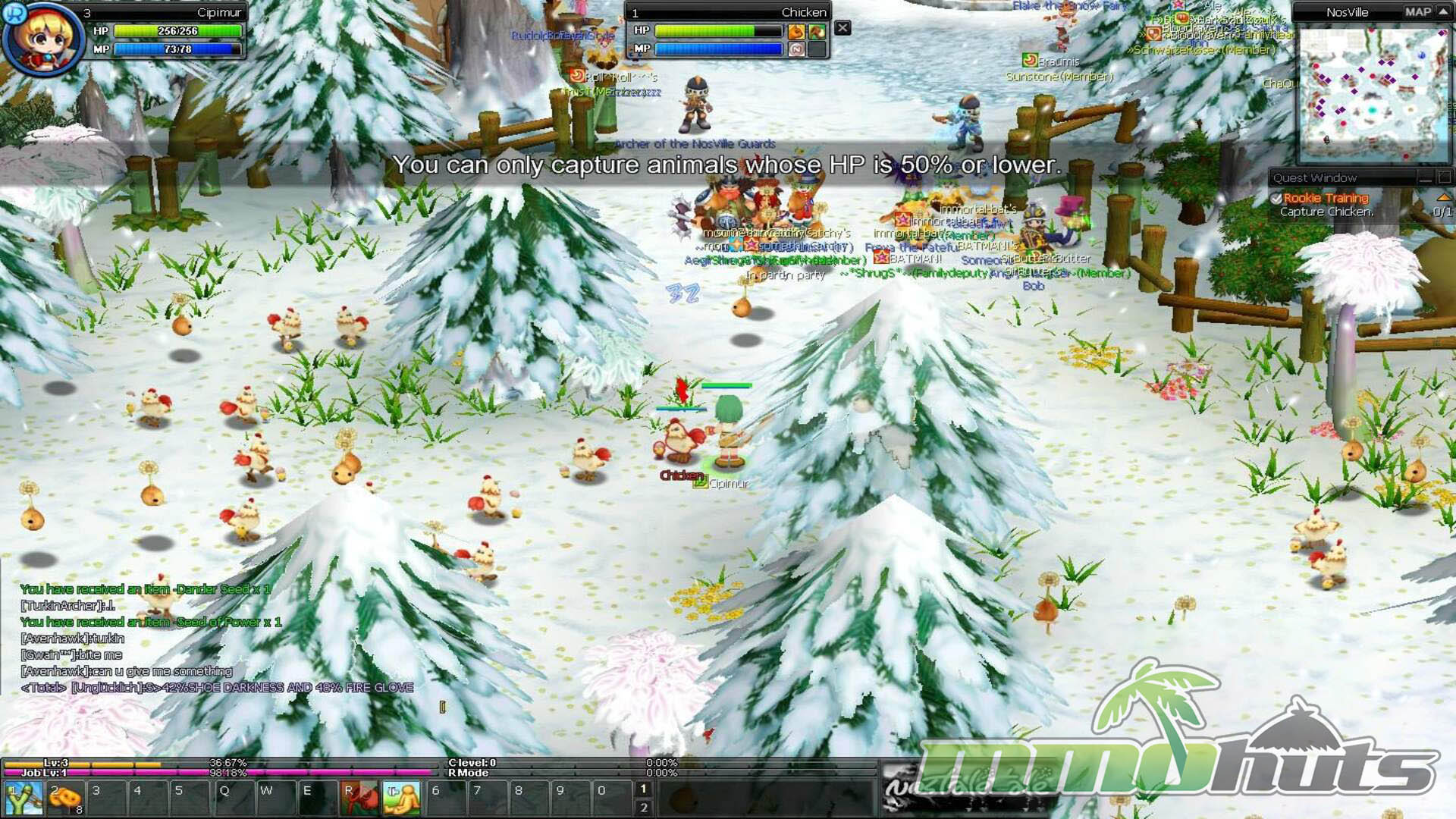 Pets can be leveled and trained, and they are not purely cosmetic. They can learn skills and contribute in fights, but they also come with upkeep expectations, such as feeding and maintaining loyalty, or they may stop cooperating. Alongside pets, you can also recruit a NosMate, essentially an NPC mercenary companion. NosMates can level, can be equipped with gear, and can be configured with simple behaviors like following and defending, or controlled more directly when needed. Early on you will mostly see modest creatures (farm animals and small critters), but the system is clearly built to keep scaling as you progress into higher-level areas.