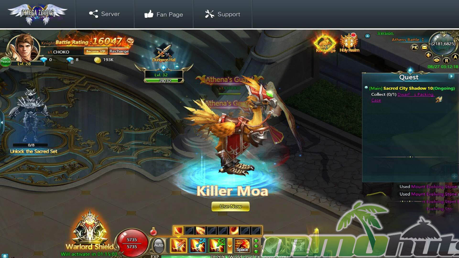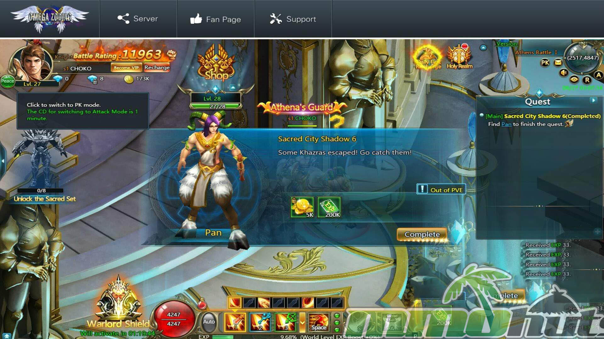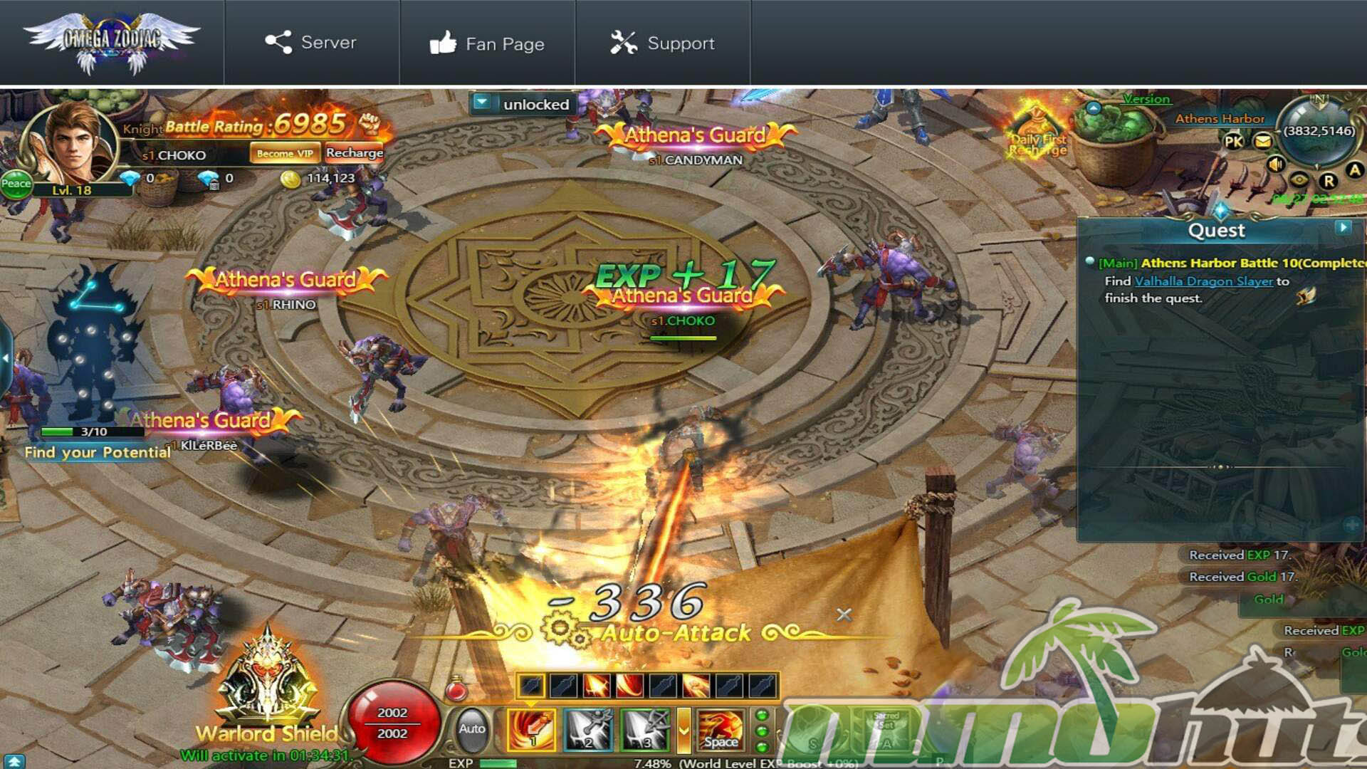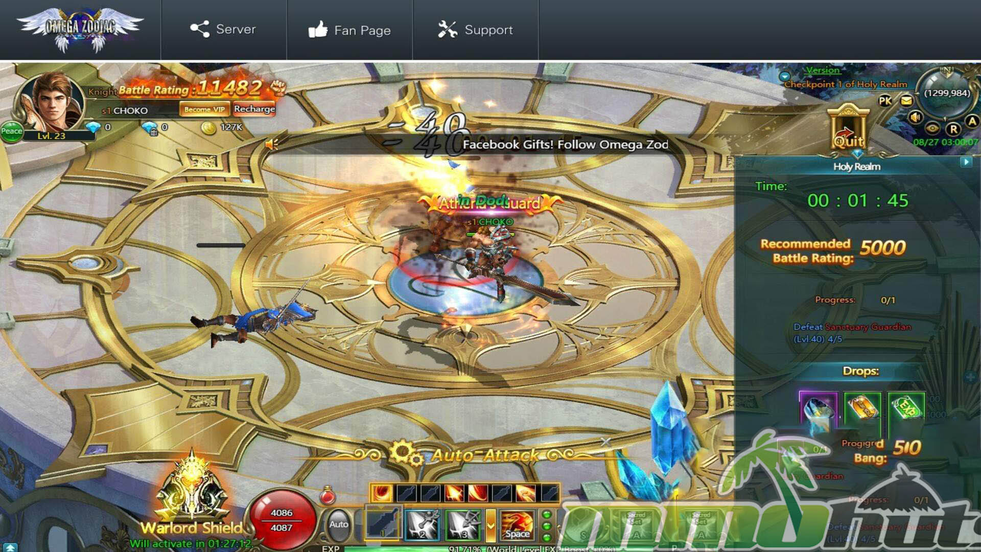 Omega Zodiac is a free-to-play browser MMORPG built around helping the goddess Athena push back an encroaching darkness. Players pick one of three combat roles, Mage, Knight, or Archer, then level through quests and monster hunting while constantly upgrading equipment. The game leans heavily into loot progression and flashy skill chains, with PvP and guild activities providing the competitive endgame.