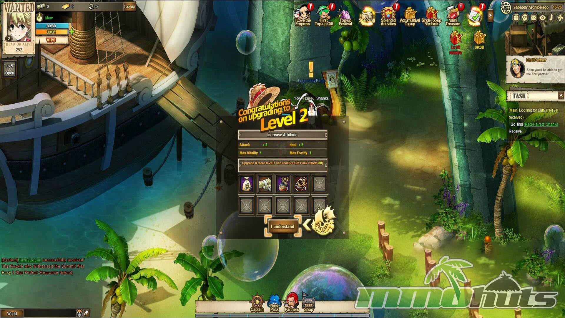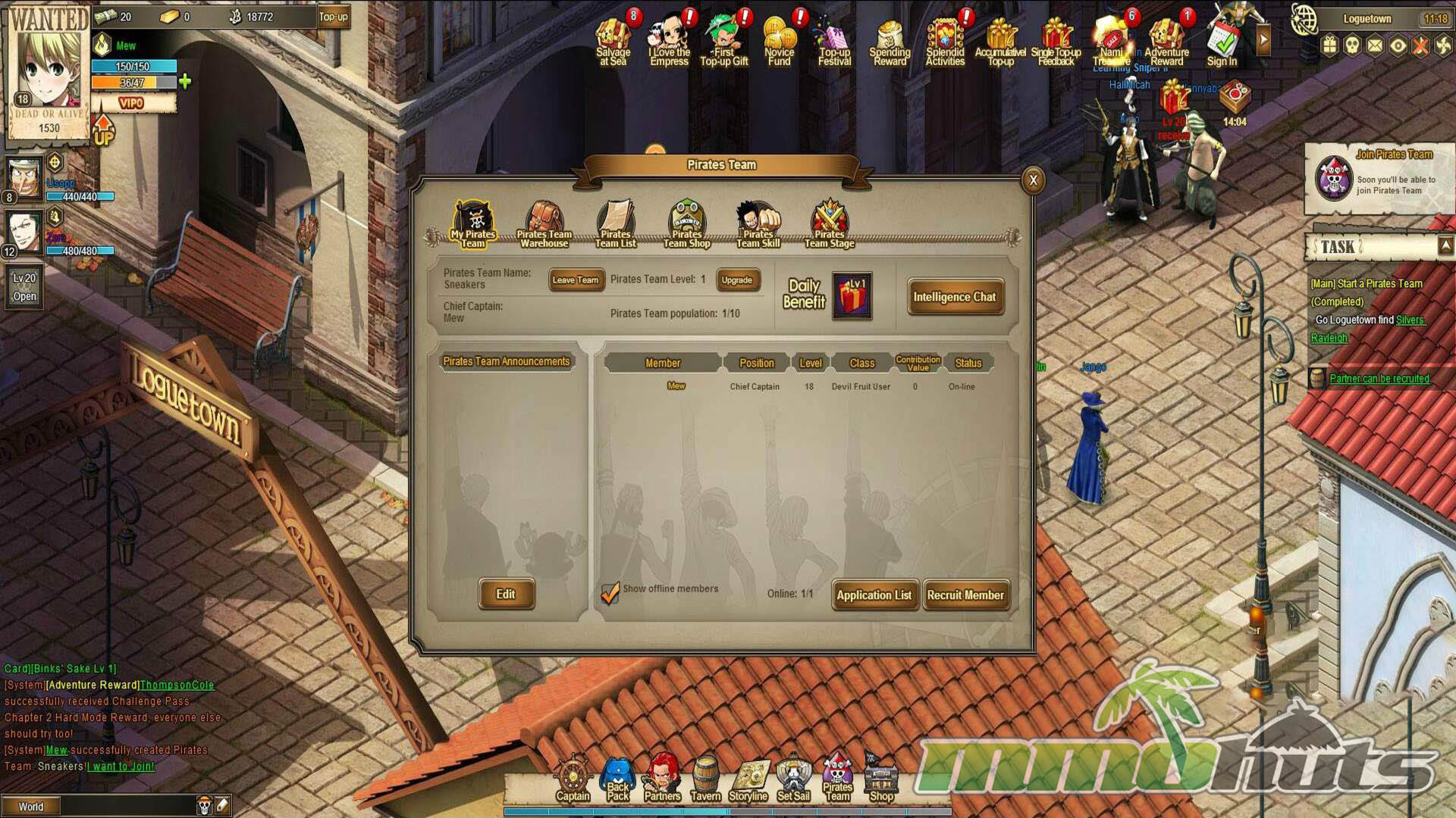 Despite the obvious One Piece influence, this is not a licensed adaptation. In practice, it feels closer to the wave of anime-themed browser MMOs that reuse familiar UI layouts, progression loops, and monetization patterns, then swap in a different coat of paint. The setting is presented as a One Piece style pirate hub (visually reminiscent of places like Sabaody), and the narrative pulls in recognizable names and motivations, but it is more of a loose mashup than a coherent retelling.