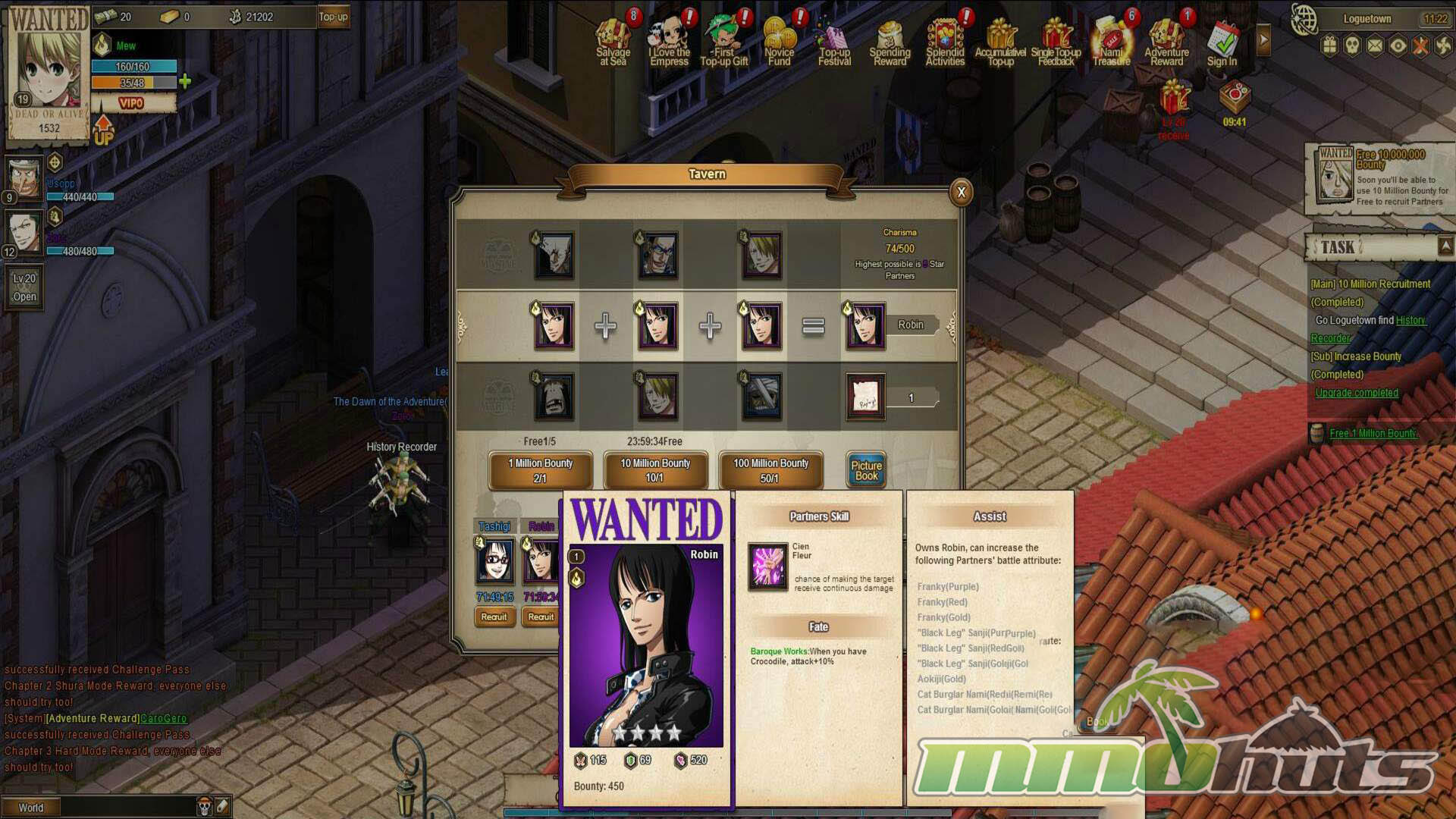 Building a party is one of the main long-term hooks. Through the Tavern, you can attempt to recruit well-known characters via a random roll system that functions like a slot machine. Those attempts cost Vivre Cards, with a small number provided early and more available through rewards or purchase options. Once recruited, partners level alongside you and can be trained at the ship gym using the standard in-game currency (listed as Belis, possibly intended to be Berries).