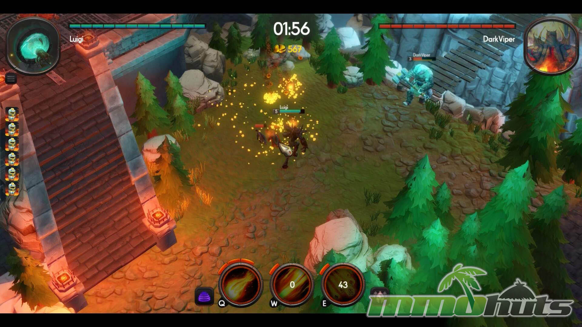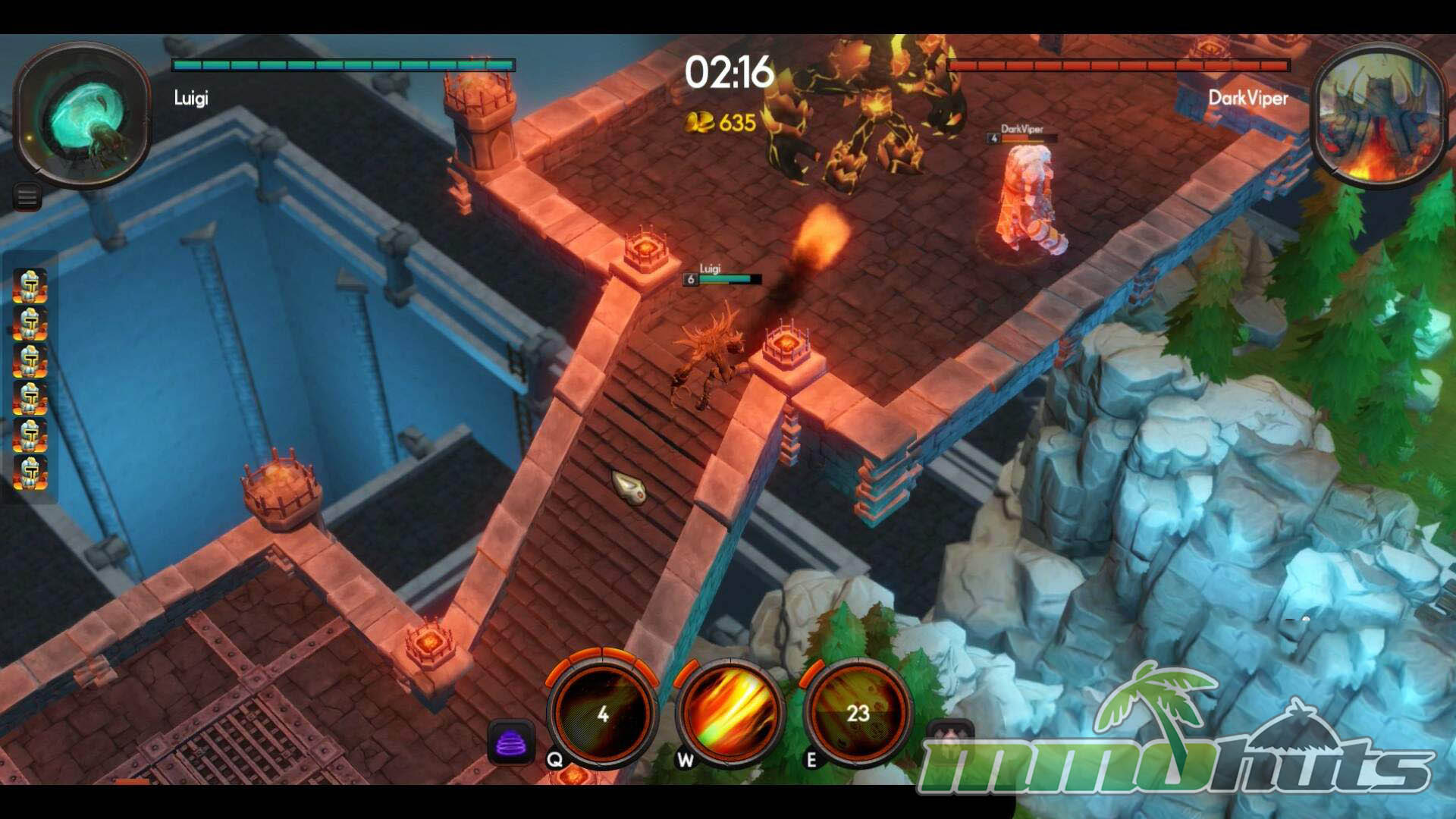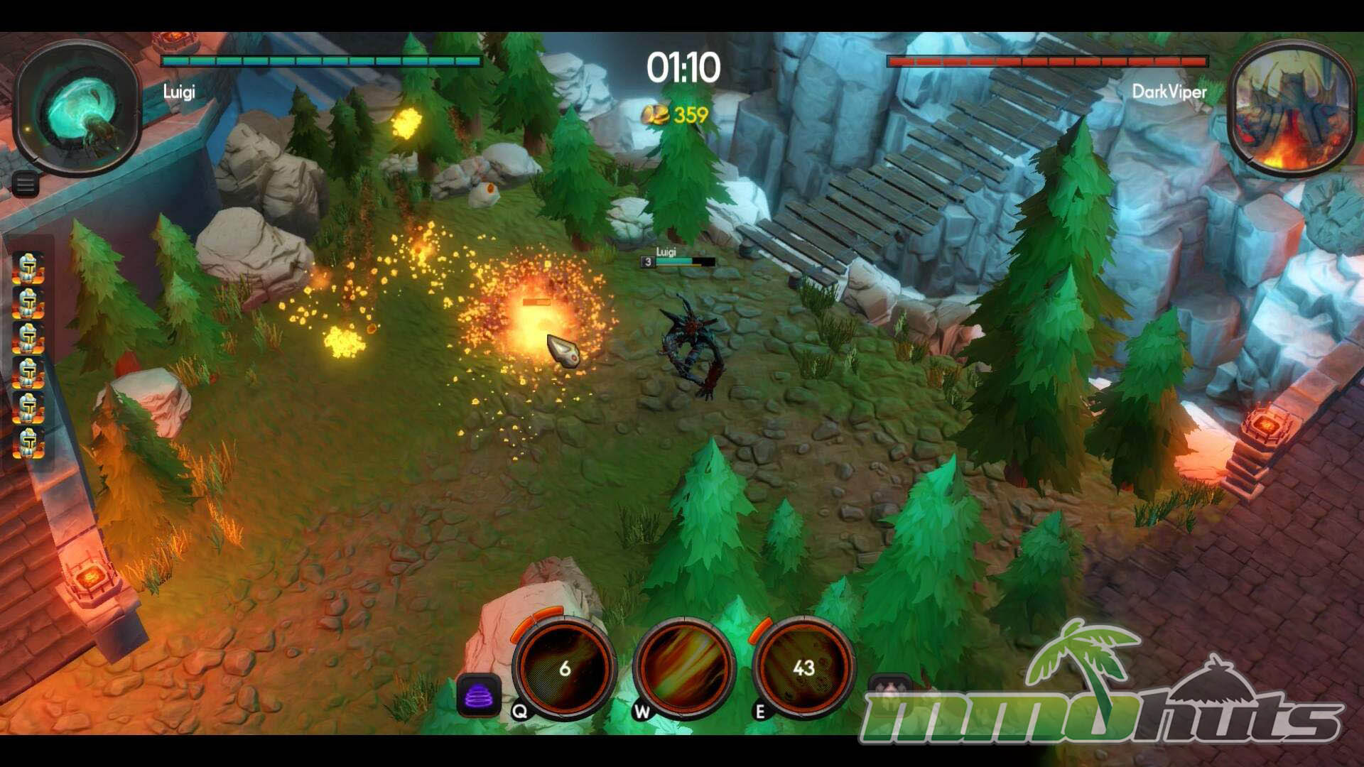 Outside the lane, maps include additional points of interaction. Neutral camps can be cleared for extra gold and temporary combat buffs, giving you a reason to rotate and fight over side objectives. Health packs provide sustain between engagements, and trap switches add another layer of positioning, since a well-timed trigger can punish an opponent who is chasing, retreating, or scrambling for a pickup. The game also frames its battles with setting and lore, including references to the Flame that ties the arena conflict together.