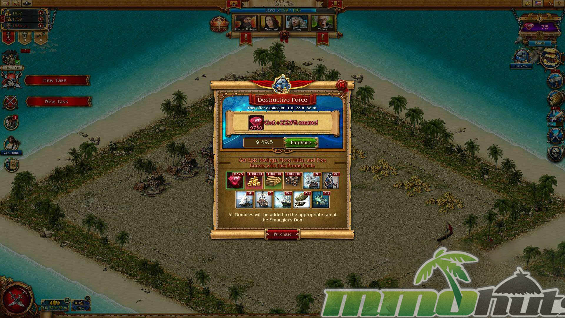 Pirates: Tides of Fortune is a free-to-play, 2D browser strategy MMO from Plarium, the same studio behind Stormfall: Age of War and Soldiers Inc. The core loop will be familiar to anyone who has played a timer-driven base-builder: you develop a central hub, invest resources into upgrades, unlock better troops, and then use those troops to take even more resources from the map, especially from other players. The pirate theme does a lot of heavy lifting, giving the genre’s usual menus and upgrade chains a more flavorful coat of paint, even if the underlying structure follows Plarium’s established formula.