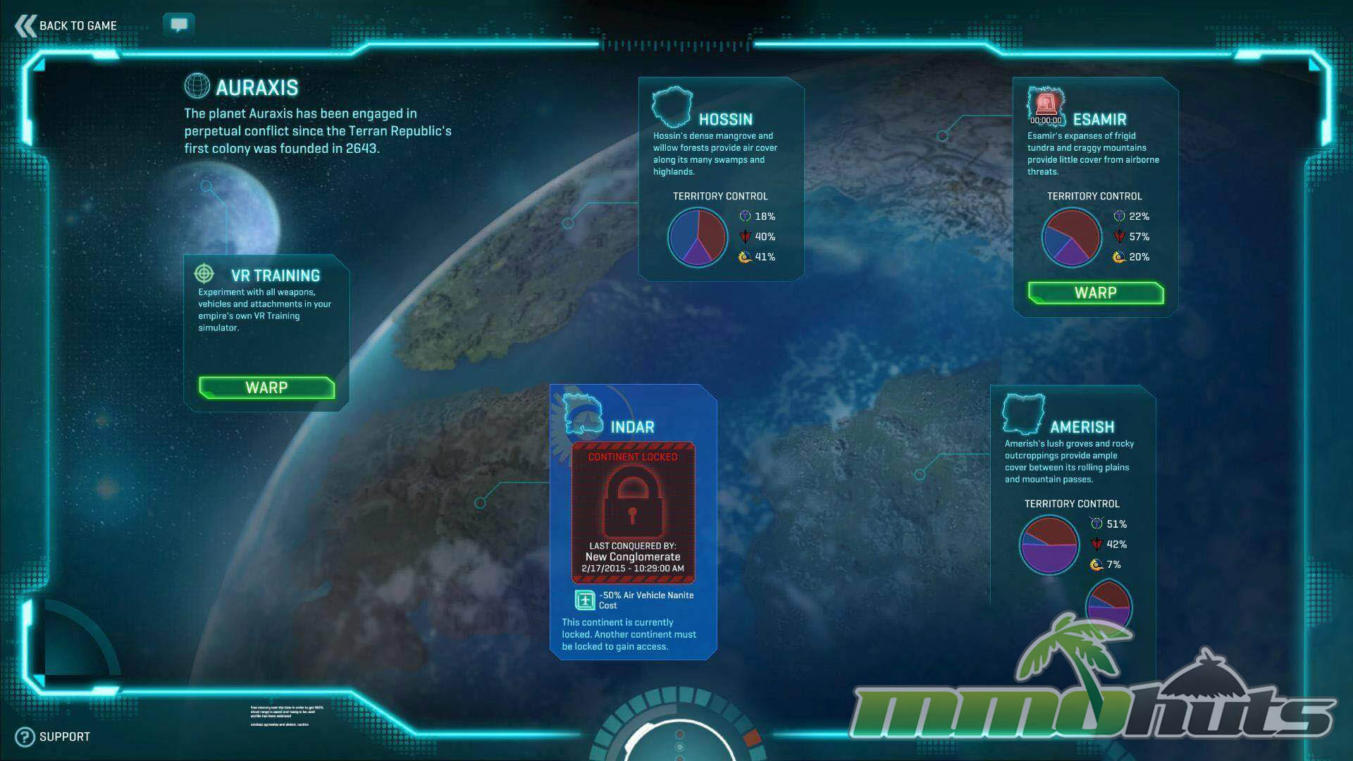 - Persistent State World Gameplay – factions vie for control over continents (Amerish, Esamir, Hossin, and Indar).