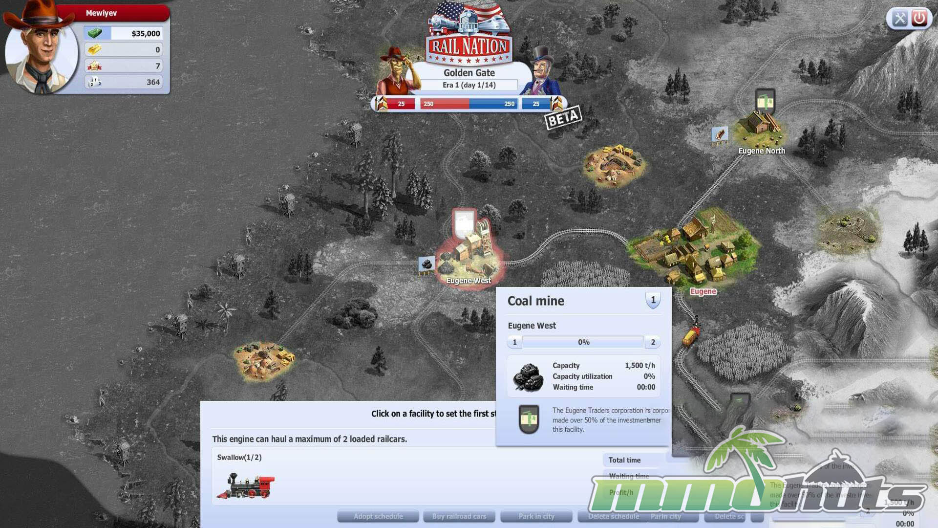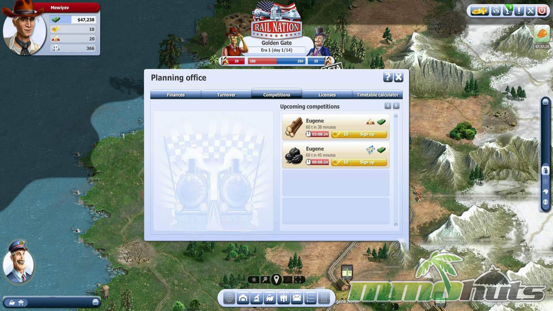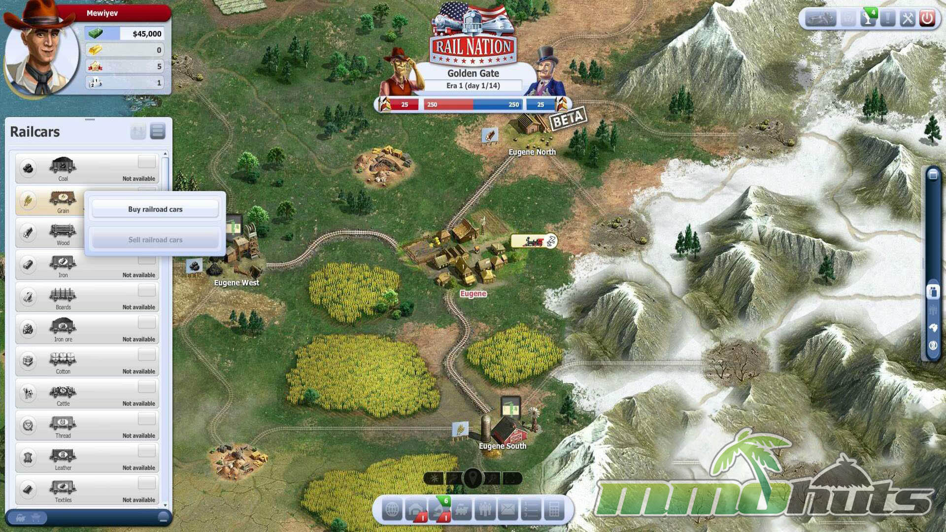 Rail Nation is a 2D, browser-based strategy MMO focused on building and optimizing a railroad business. At the start you align with one of two unions, the Western Pacific Railroad or the Eastern Atlantic Railway, then select a hub city to serve as your home base. Your central station acts as an operations center with several upgradable buildings that support your network, such as an engine shed for managing locomotives, a lottery building for extra perks, and a laboratory tied to research and improvements. As you invest in these facilities, your railroad becomes more efficient and better equipped to compete.