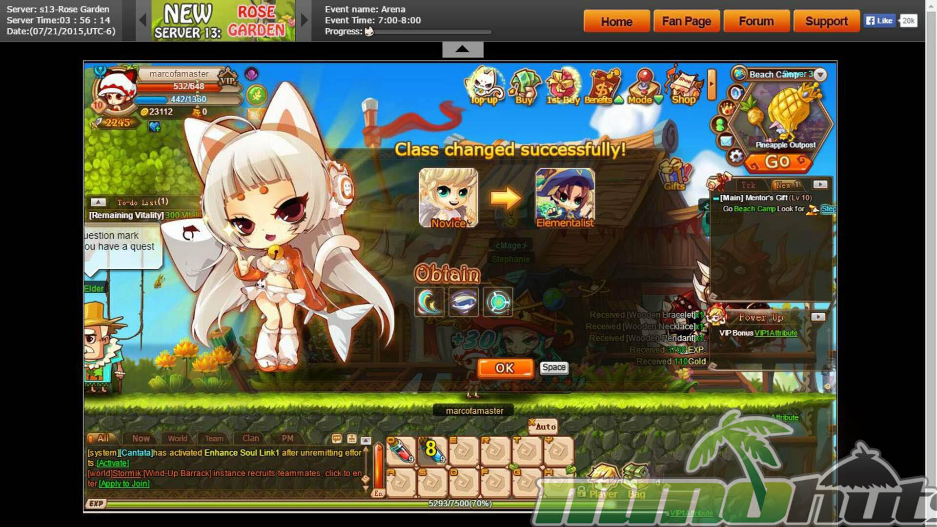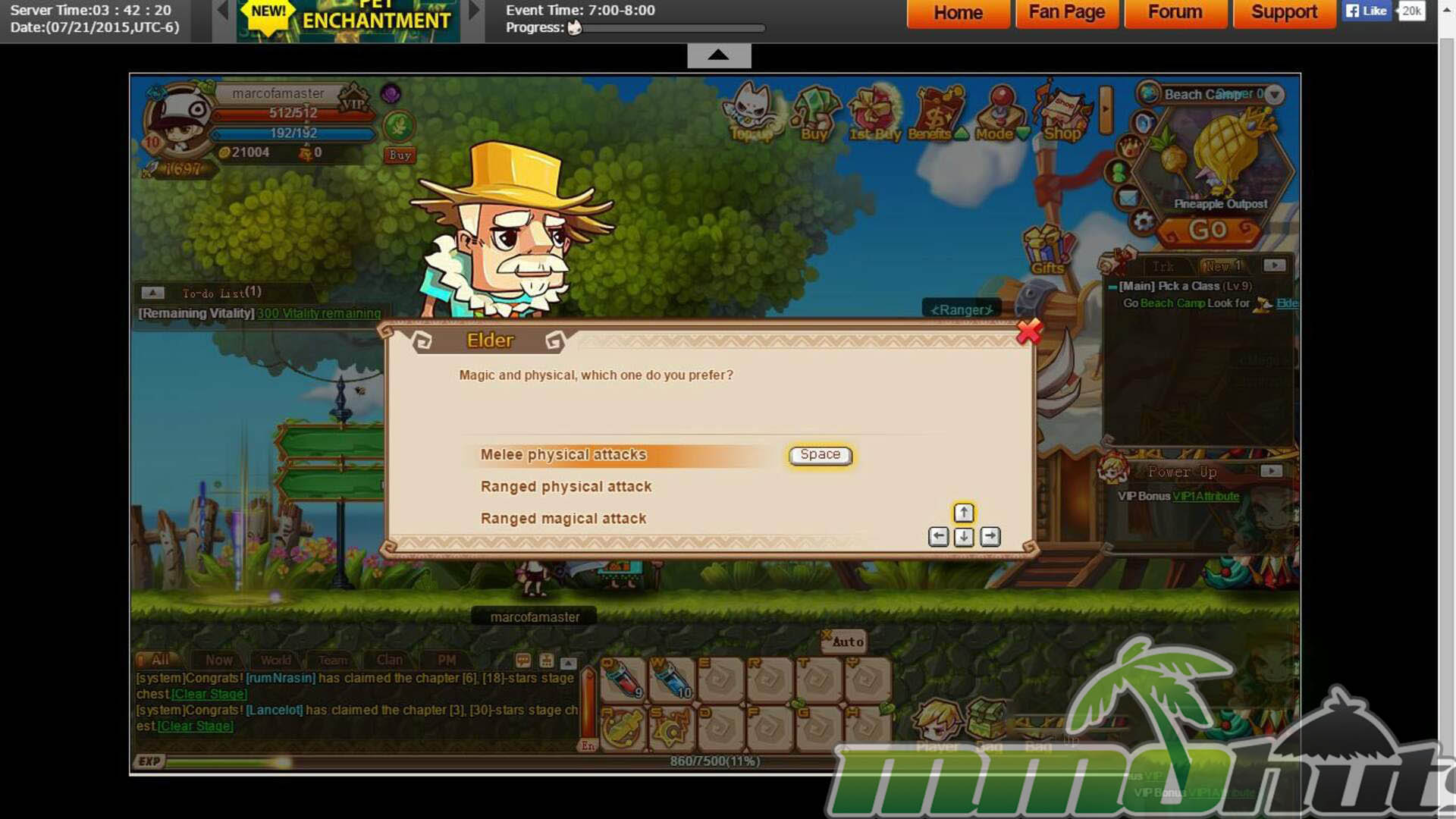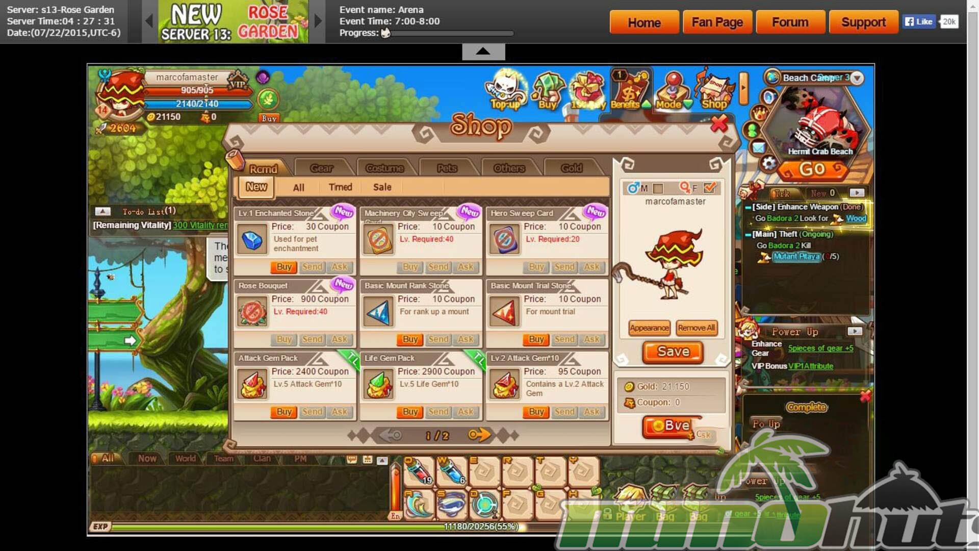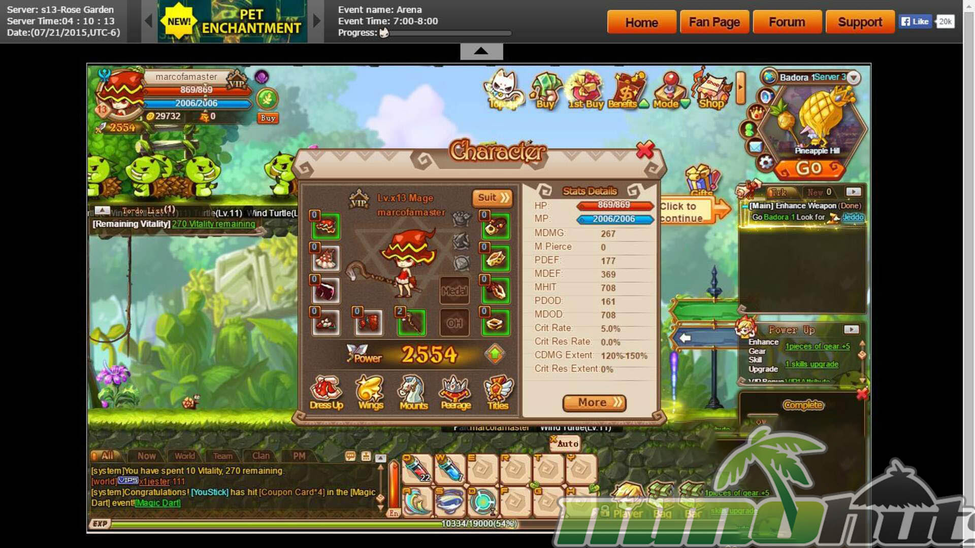 Once you lock in a class, Rainbow Saga opens up more of its systems and begins to resemble a compact theme-park MMO: gear progression, upgrade paths, pets, mounts, and instanced dungeons become part of the regular routine. It also layers in smaller daily activities like quizzes and monster-hunting events. The notable point is the sheer number of features packed into a browser-based framework, with many mechanics unlocking gradually via level requirements (for example, item enhancement requires level 15).
