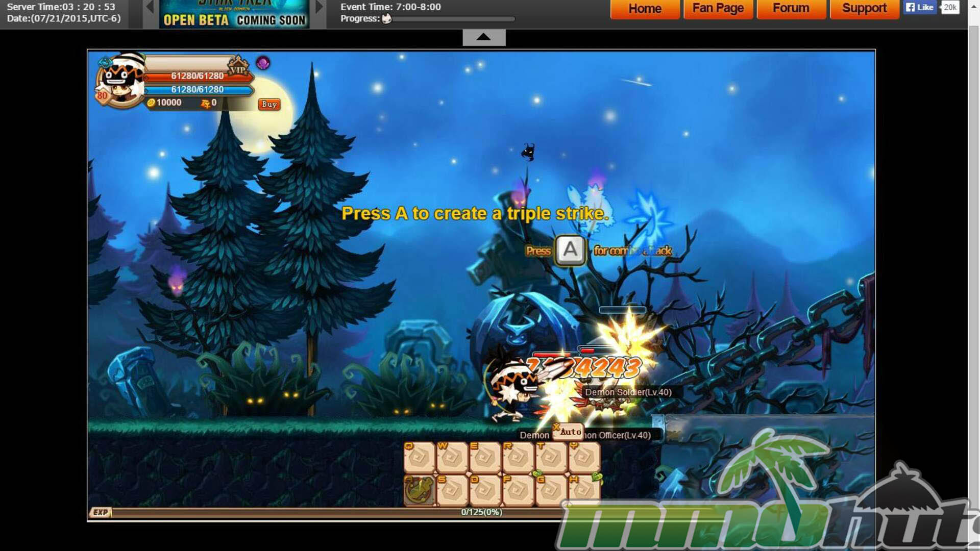 Character setup begins with selecting a gender, and the game keeps customization minimal, which is typical for many browser MMORPGs of its era. After that, you are guided through a tutorial instance that introduces movement and basic combat in a very straightforward way. Movement uses the arrow keys, jumping is on Space, skills sit across A to H, and consumables map to Q through Y. It is a keyboard-heavy layout, but the actions themselves are simple, and it does not take long to feel comfortable.