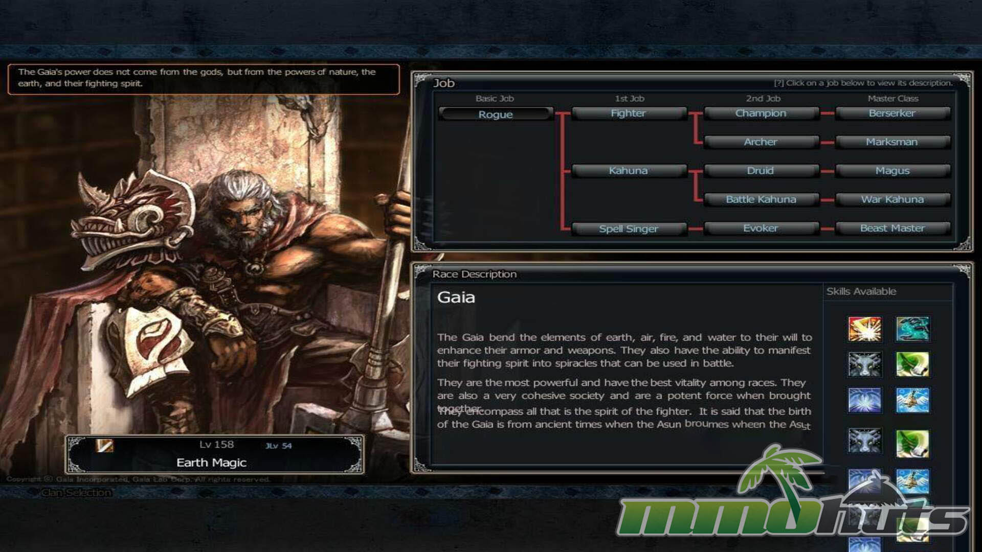 At character creation you choose between three races, each with its own multi-step job progression. Everyone begins in a basic starter role and then branches into more specialized jobs as they level, with job changes occurring at Level 10, Level 50, and the final (master) job change at Level 148.
