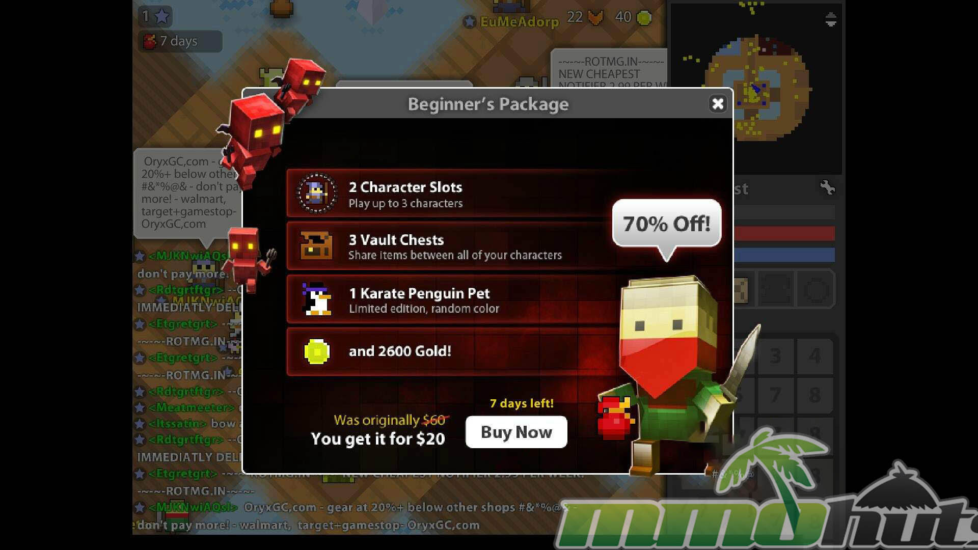 Despite the retro look, the business model is thoroughly modern. Players can purchase Realm Gold with real money and spend it in the Nexus (the game’s safe hub) on premium items. These purchases range from basic convenience items like health and mana potions to more impactful gear and pets.