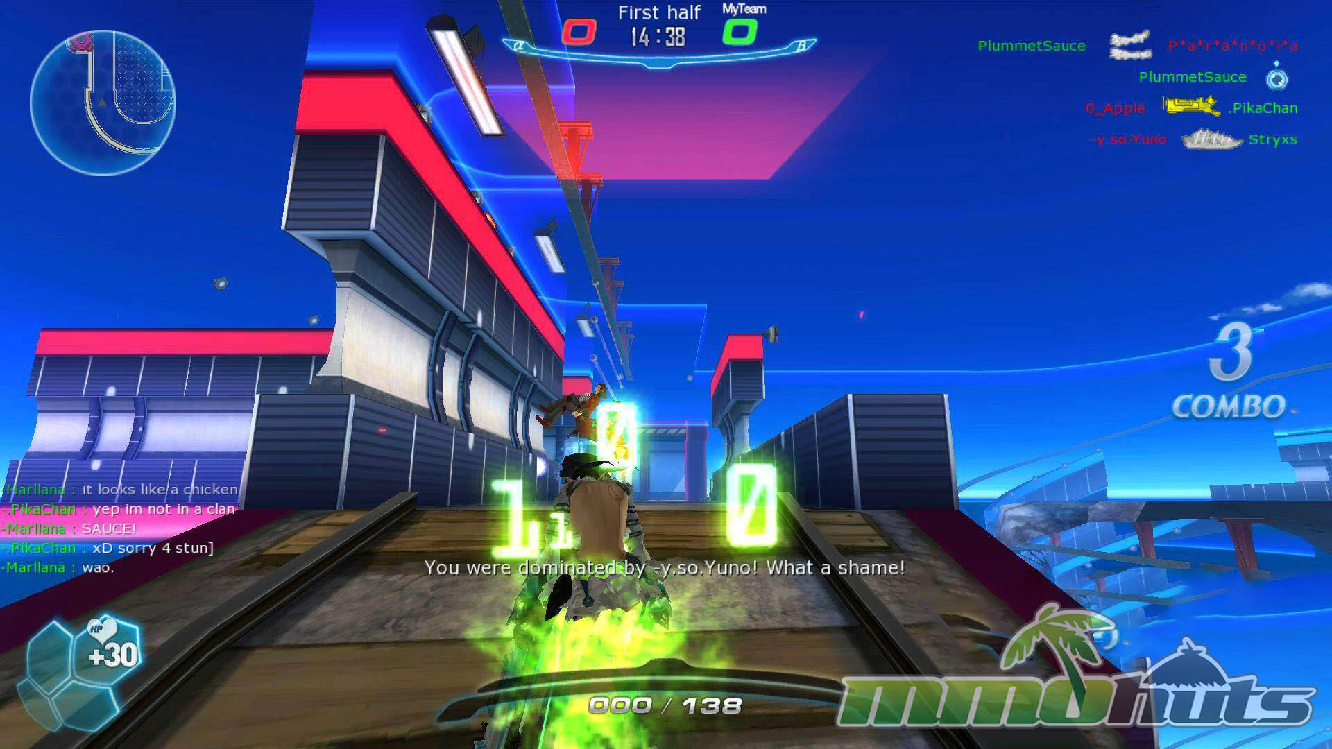 S4 League also includes an unusual comeback mechanic often referred to as the Pity System. In several modes, the game detects when a team is falling behind and grants escalating assistance based on how lopsided the score becomes. In Touchdown, for example, being down by 2 touchdowns slightly improves SP efficiency (SP fuels actions like dashing and jumping). Falling behind by 3 touchdowns increases the effect further, and at 4 touchdowns behind, the boost becomes more dramatic, removing SP drain while carrying the Fumbi and adding a damage increase.
