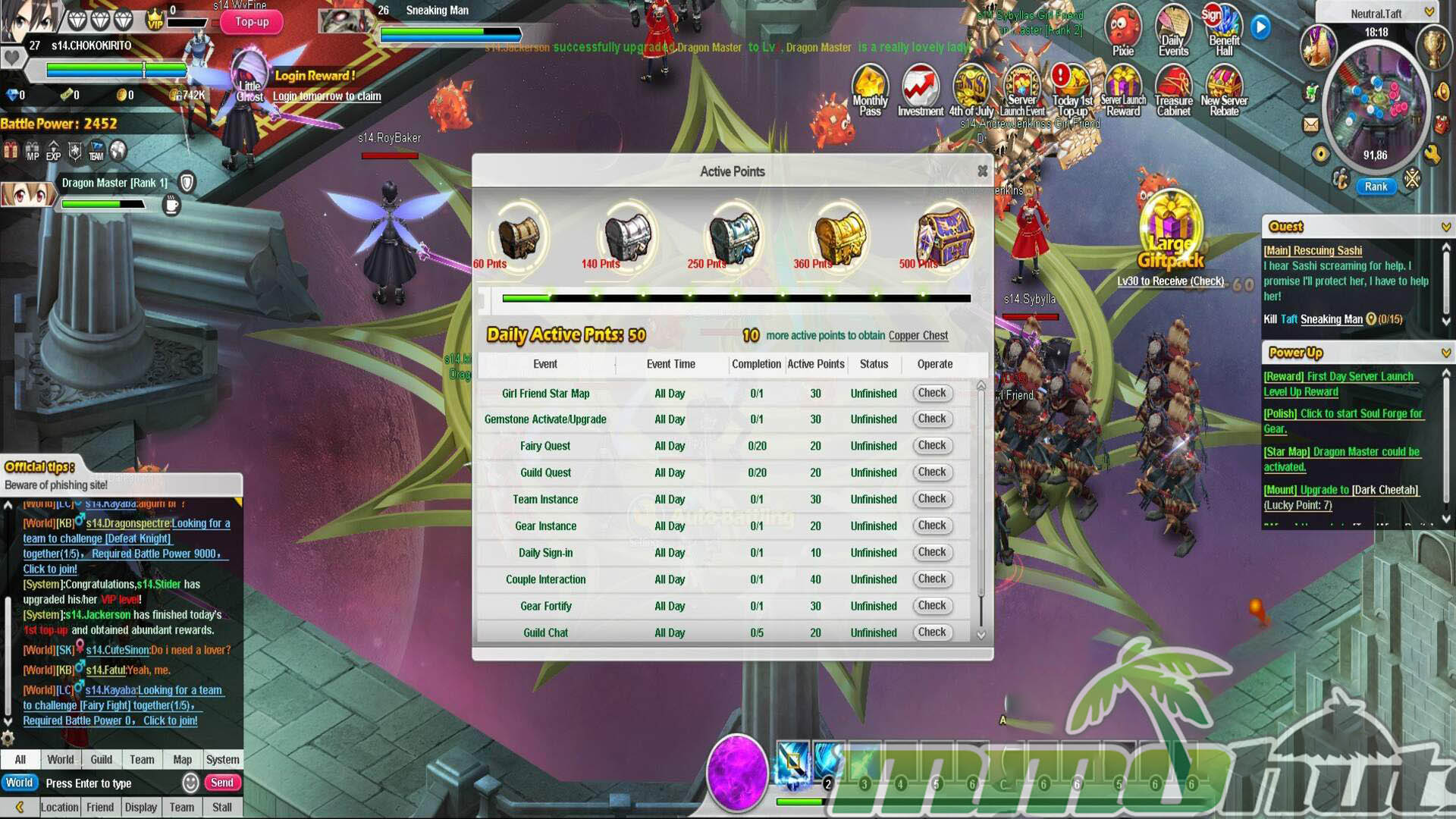 | Publisher: GameSprite Playerbase: Medium Type: Browser MMORPG Release Date: June 24, 2016 Shut Down Date: 2021 Pros: +Four playable options tied to SAO characters, each with their own roles. +Plenty of instanced activities to grind for rewards. +Companion Girl Friend (pet) and a marriage feature. Cons: -Localization quality is rough in places. -Heavy reliance on auto systems reduces hands-on gameplay. -Pay-to-win pressure. |