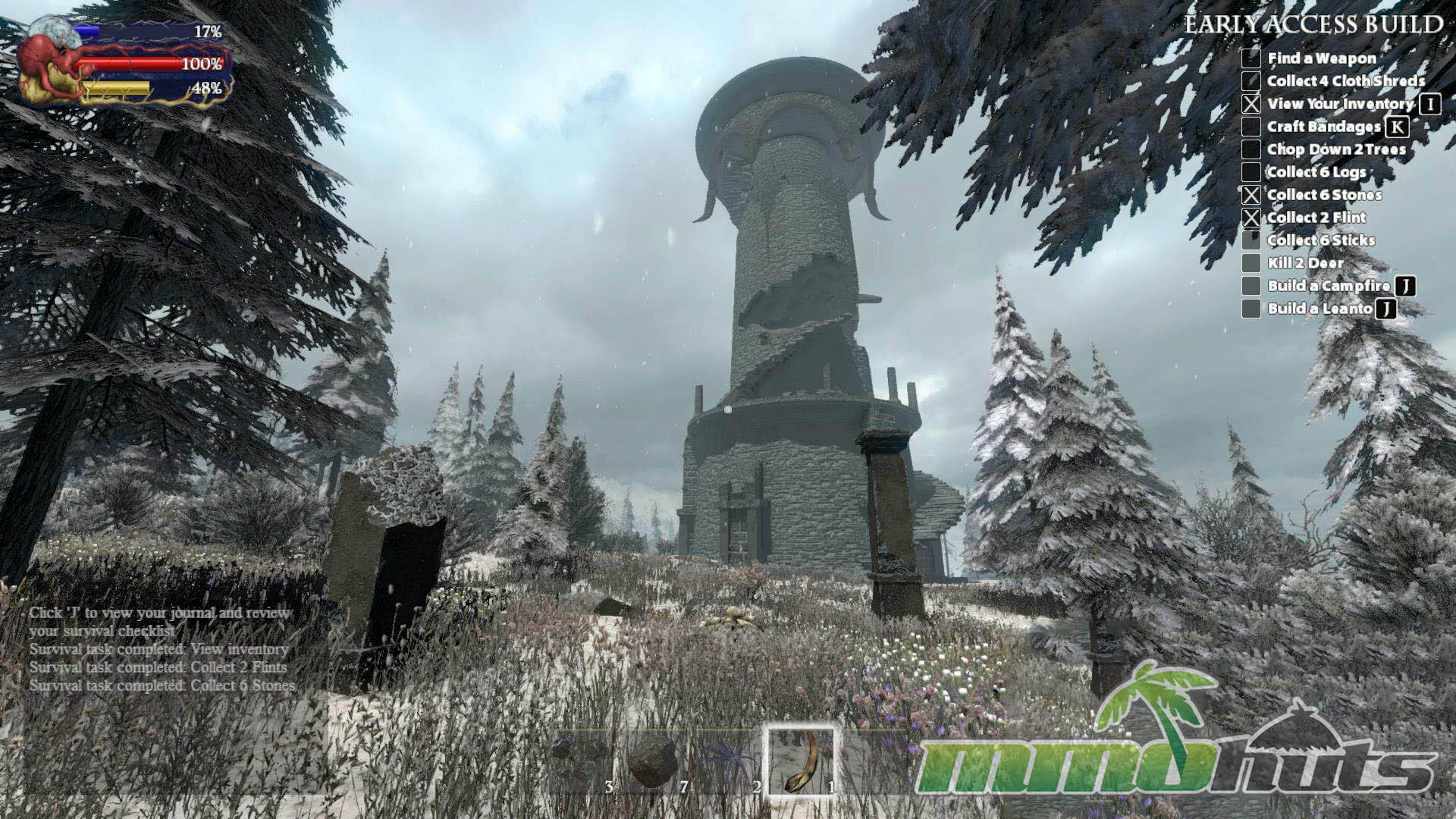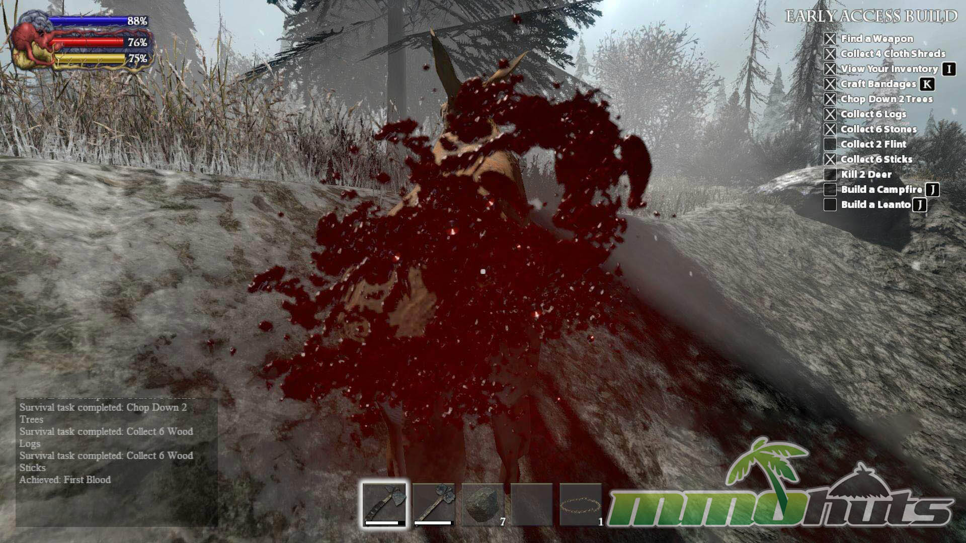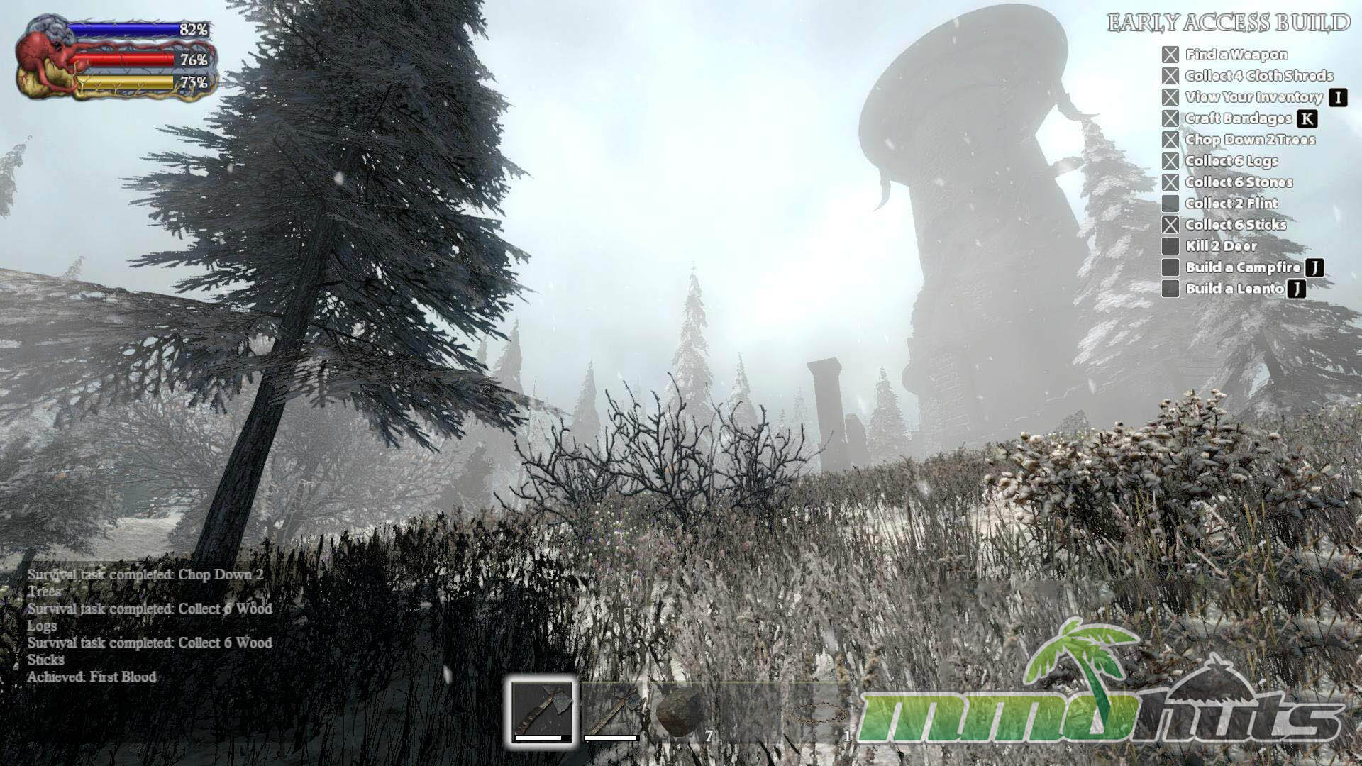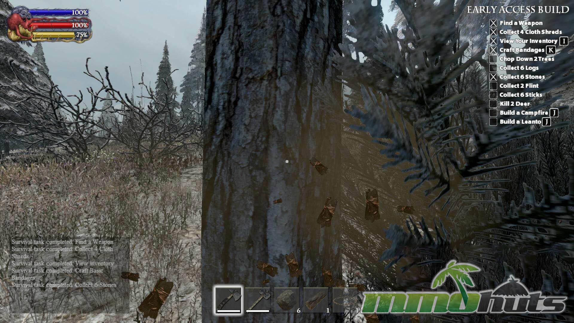 Spawns generally put you near a coastline where basic supplies can be found if you search intelligently. Wandering too far down the beach without a plan can leave you under-equipped and exposed, and the island does not give you much time before cold becomes lethal. Once you do get a hatchet in hand, the gathering loop becomes more satisfying. Cutting a pine down and then processing the trunk into usable logs feels like a clear, readable step-by-step action, even if the overall handling can be a bit stiff.