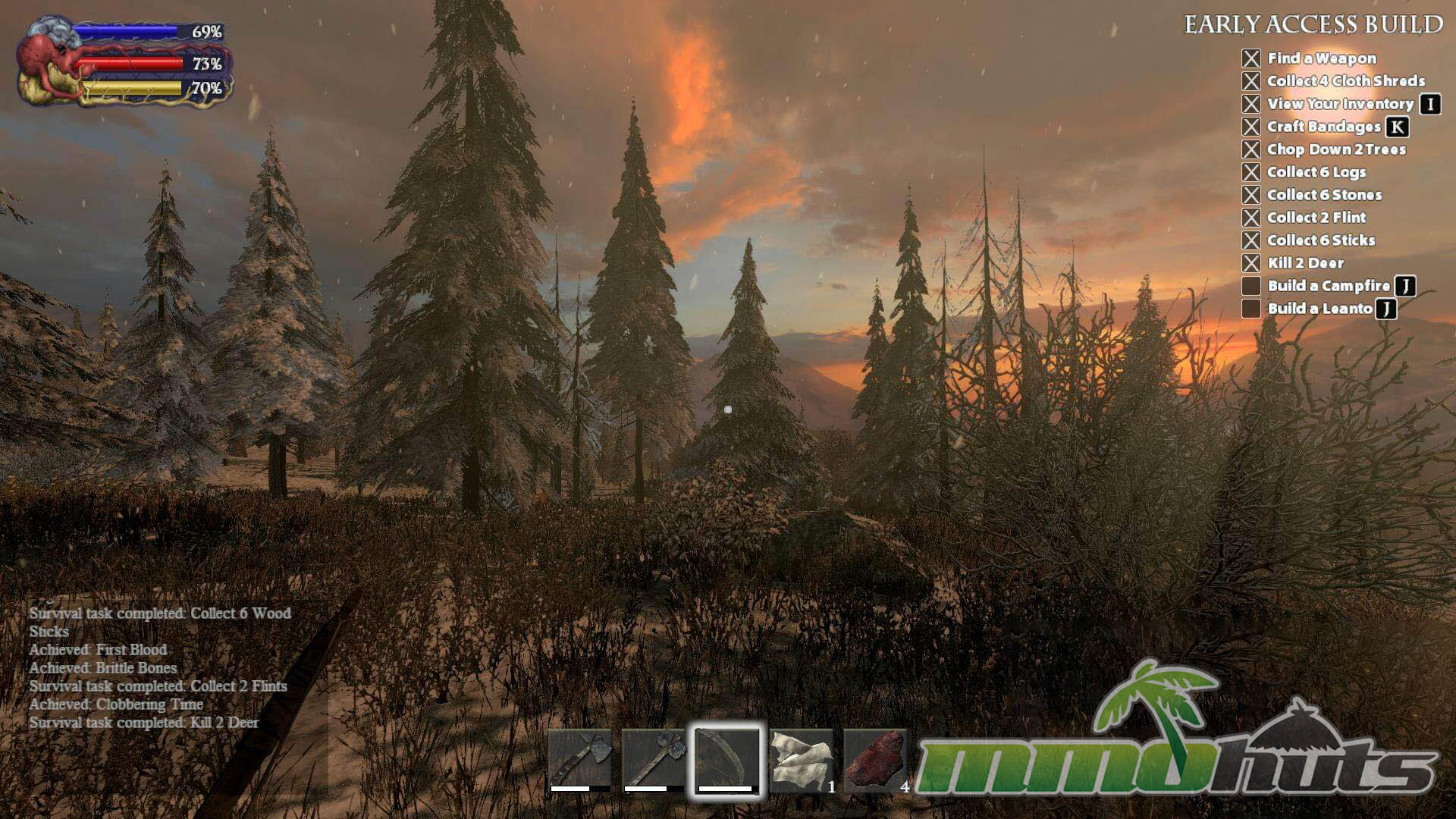 Hunting and creature-slaying feed directly into progression. Deer provide meat and leather, wolves and other threats can be harvested for crafting components, and eventually you are expected to gear up for larger encounters with creatures like Forest Giants and Kur Dragons. The environment itself is an enemy, especially after dark, when temperatures plummet and exposure becomes a constant problem. Fires, shelter, and better armor are not optional, they are the difference between stabilizing for the next day or dying in the snow.