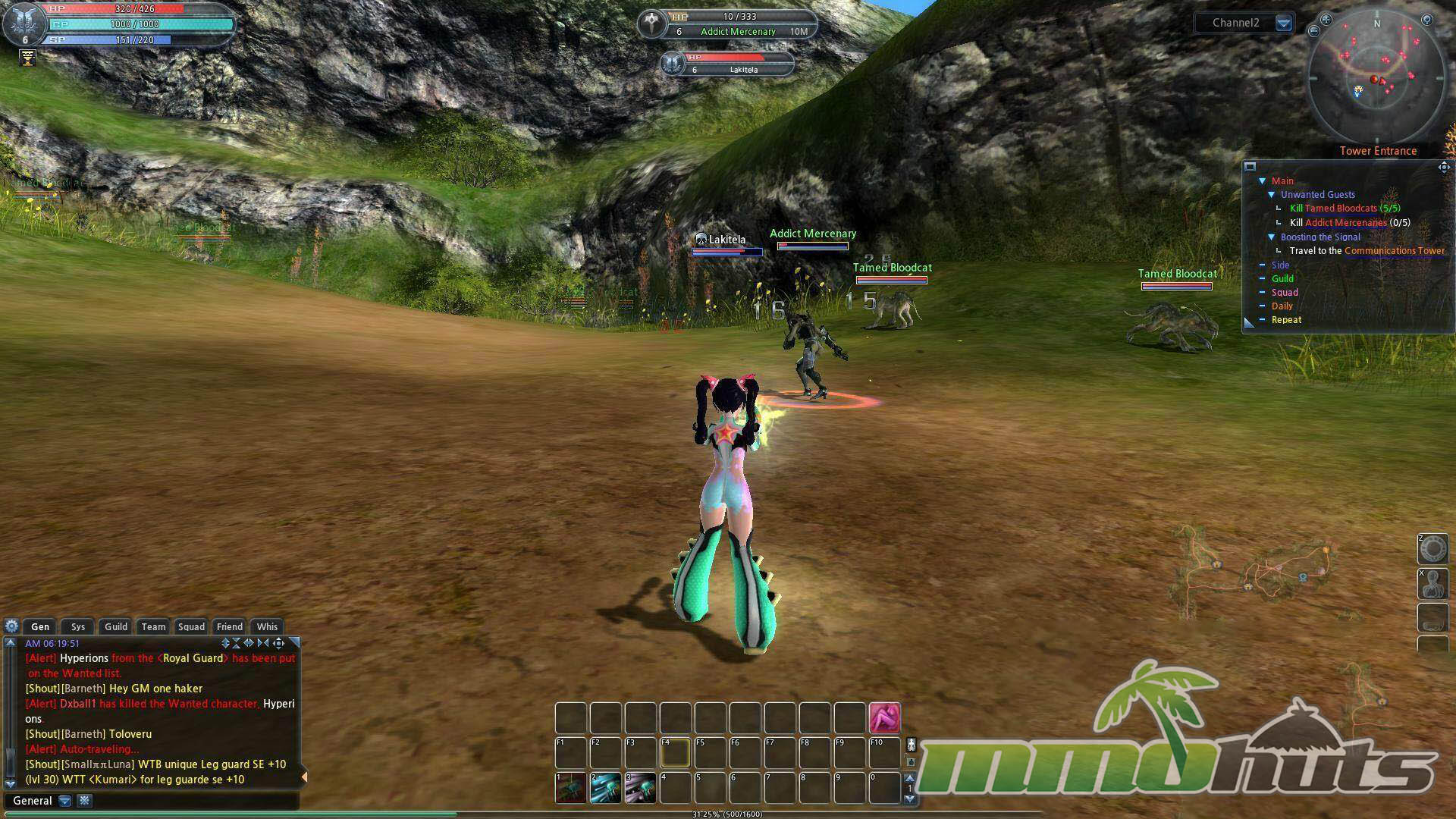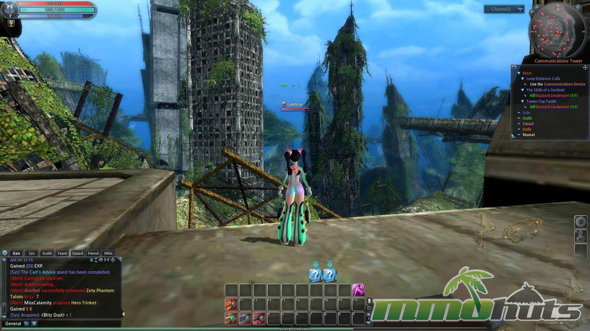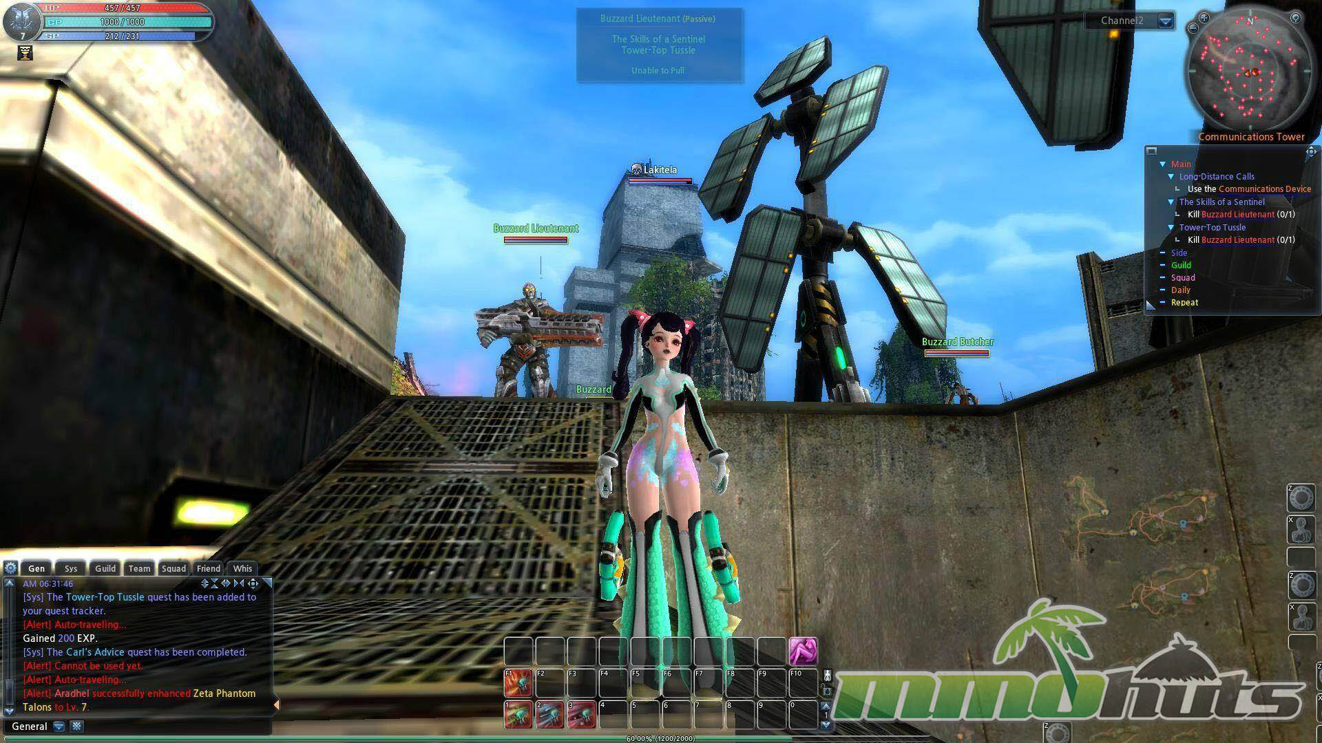 Although Scarlet Blade markets itself with a sci-fi label, much of the moment-to-moment questing can resemble a standard fantasy MMO routine, roaming fields, clearing creatures, and moving between hubs. The most overt sci-fi flavor tends to come from the towns and mech transformations rather than the average outdoor objectives. Questing is also very guided, with convenience features that allow you to click the tracker and be led directly to targets, which reduces friction but can also make leveling feel overly automated.