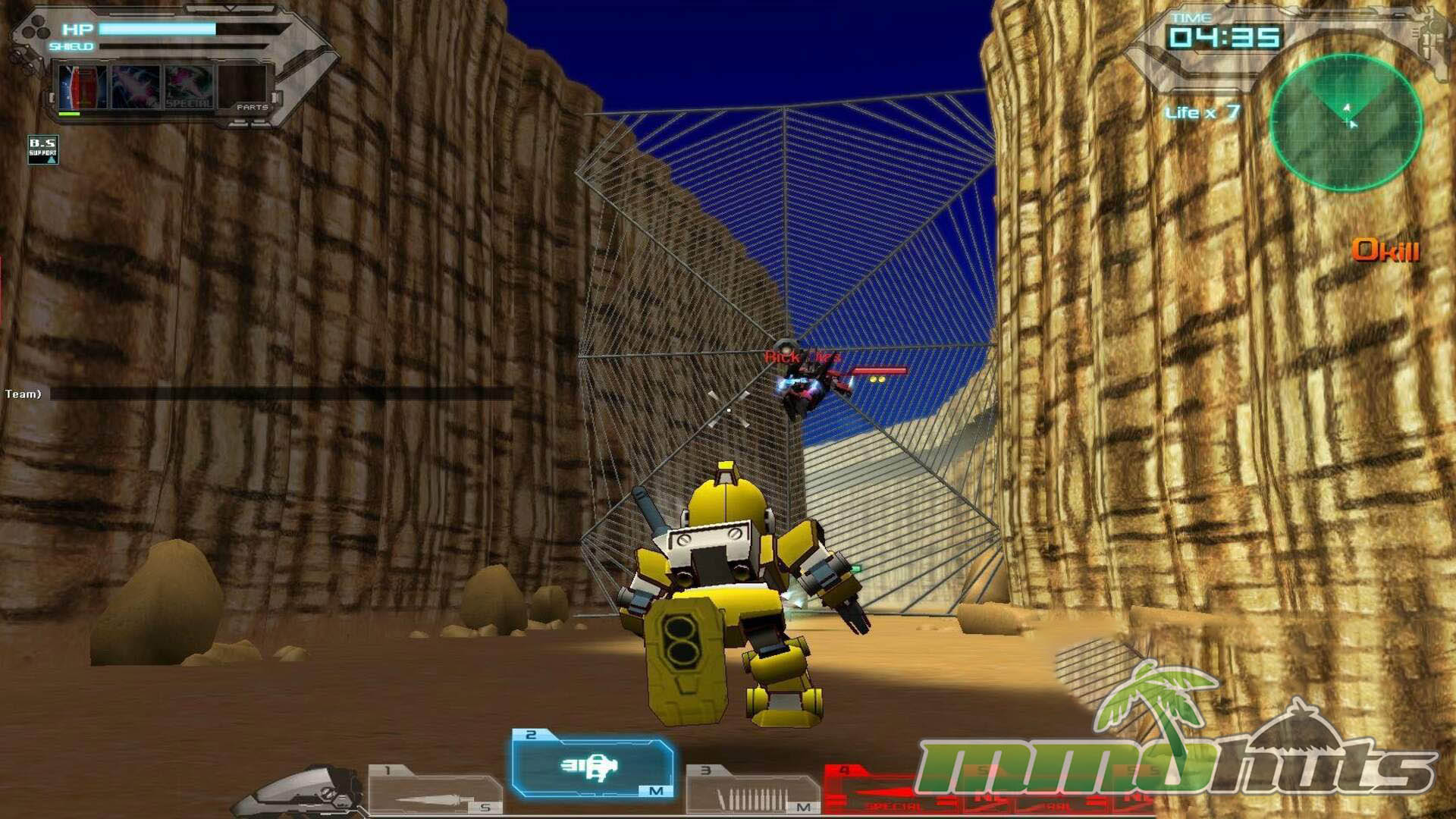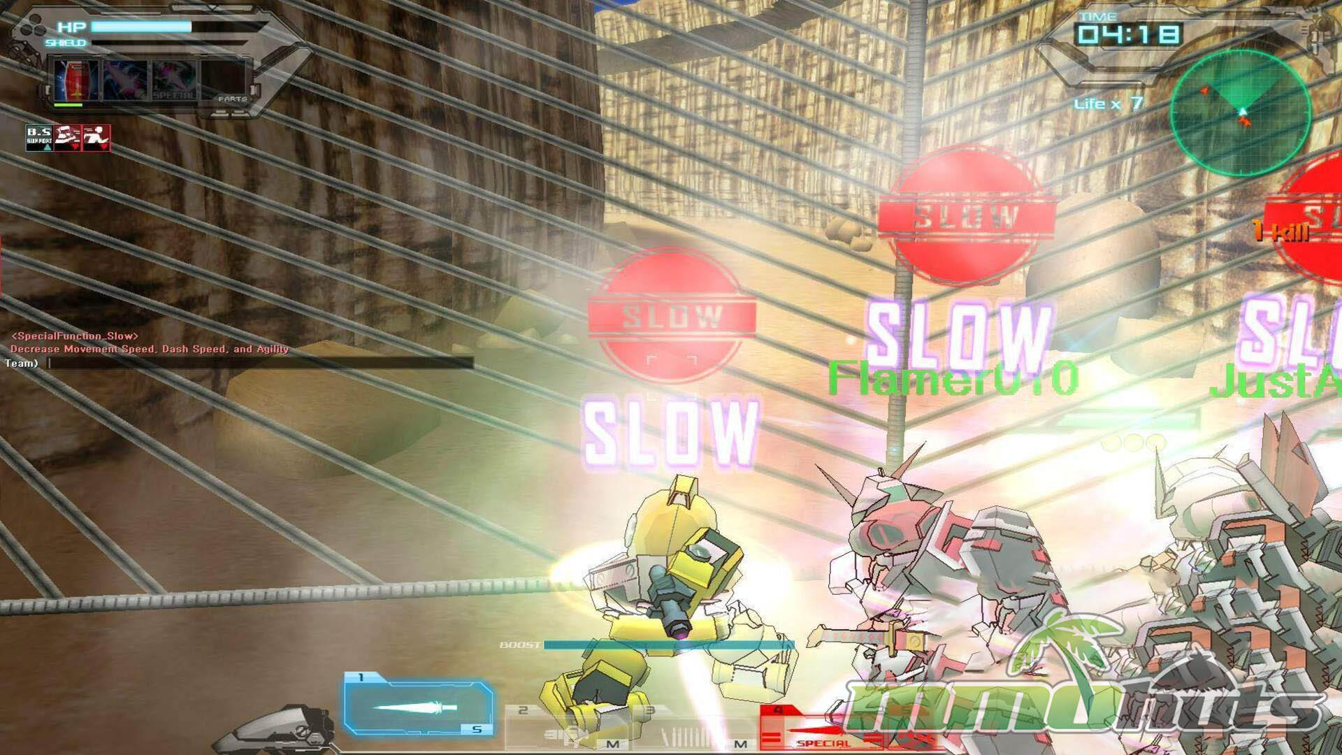 Normal is straightforward team-versus-team scoring. Death keeps the team format but shifts the win condition into a last-man-standing style. Boss adds a twist by empowering one randomly selected player who grows larger, scores extra points for kills, and becomes a high-value target that awards the opposing team extra points when defeated. Single is a free-for-all. Tag and Grid take place on battleships with multiple units involved, and both lean into suit swapping as a mechanic. In Grid, teams work to push the enemy score from 300 down to 0, and each death forces a switch to a different suit. Tag plays more like a Death match but allows switching before you go down, and the battleships can contribute attacks as well.