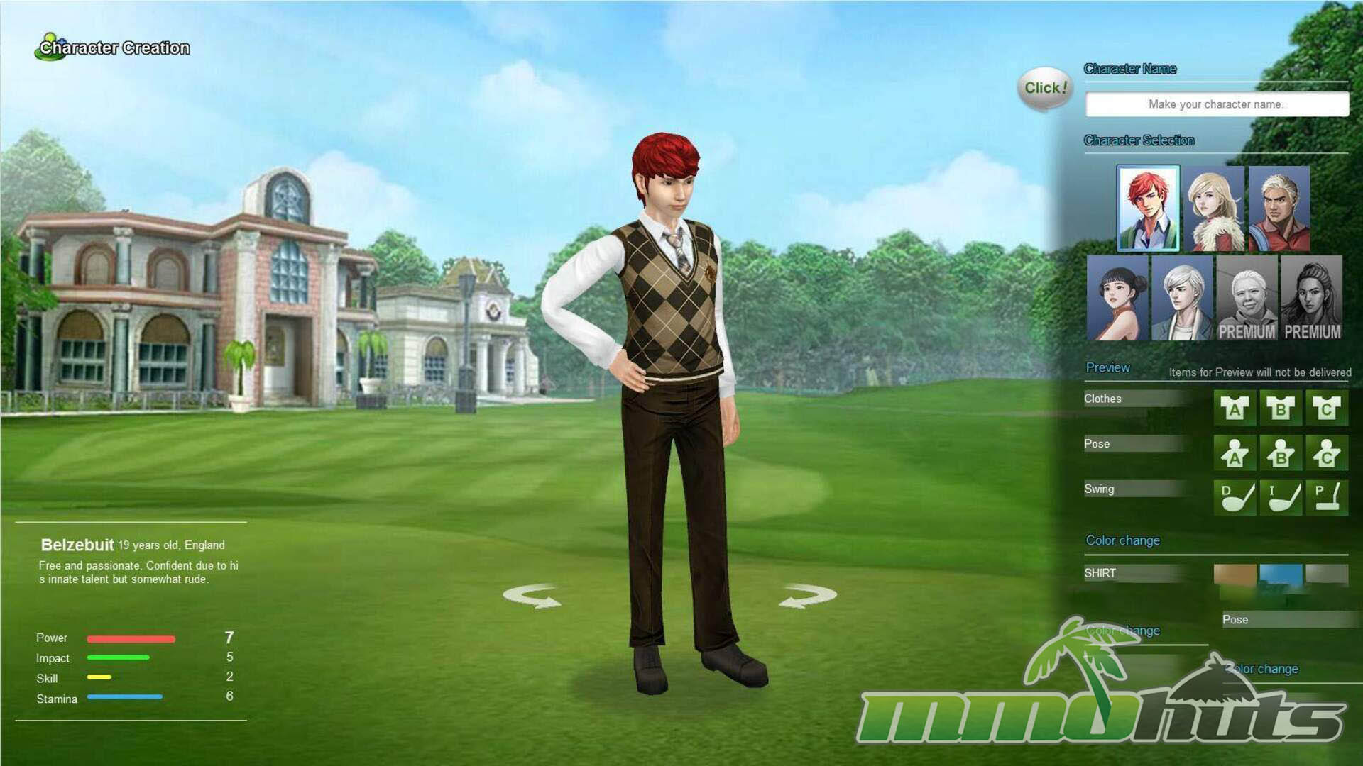 Players choose from a small roster of characters, five available by default, with two additional options reserved for premium membership. Progression is tied to four core attributes, power, impact, skill, and stamina, and leveling gives you points to shape how your golfer performs. The result is an MMO loop built around improving both your character sheet and your personal execution.