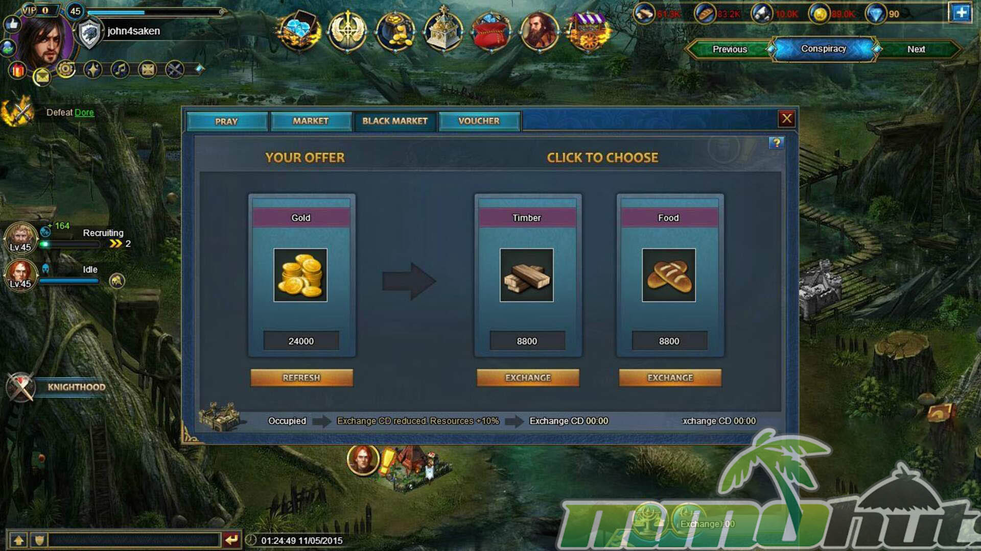 Resource management was built around the expected medieval staples. Sawmills produced wood, Farms generated food, and Dwellings provided gold. Upgrades increased storage and supported the rising costs that came with progression. Active players could sometimes keep certain production levels modest while prioritizing other development, but eventually storage and income upgrades became difficult to avoid. The game also offered a “prayer” option for extra resources. You could use it a limited number of times per day, after which additional uses required Diamonds, the premium currency.