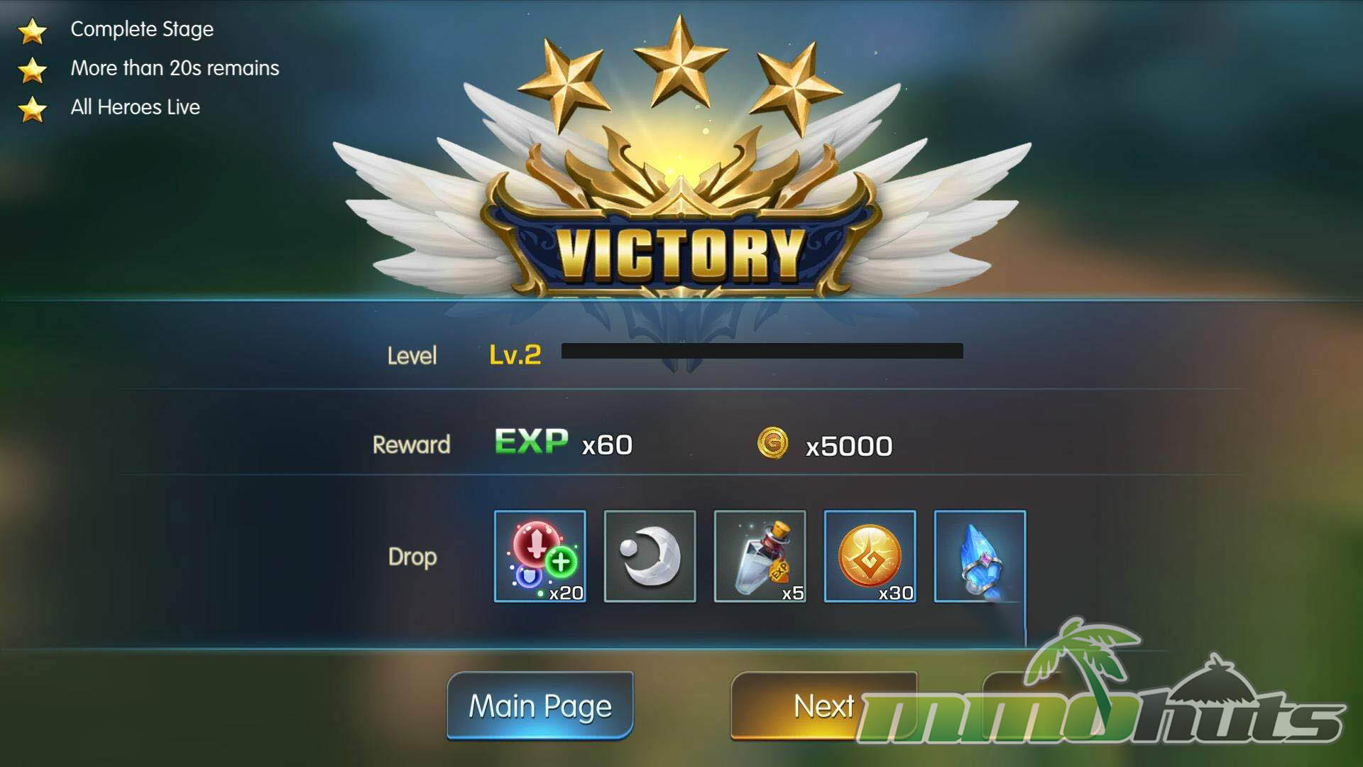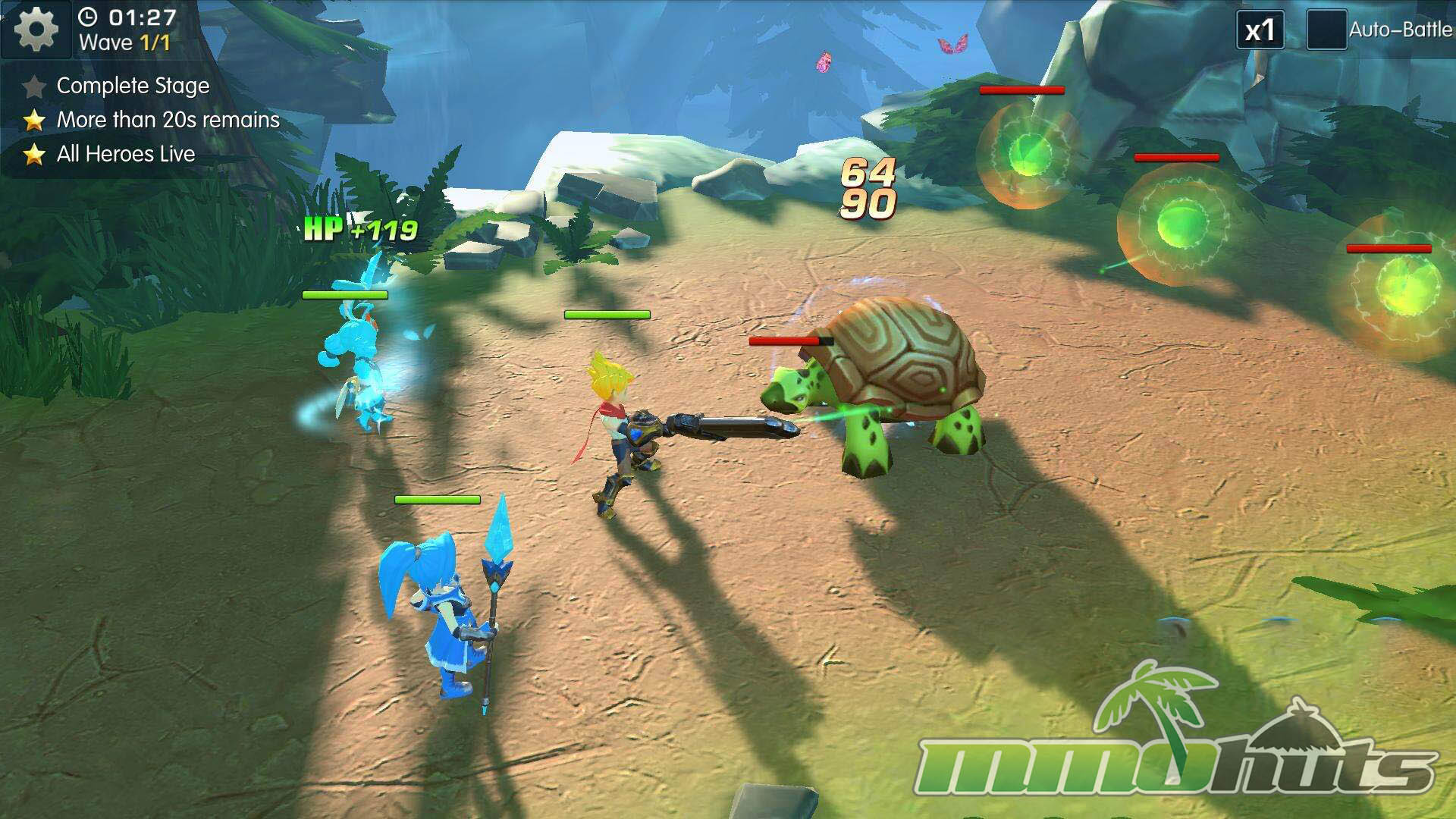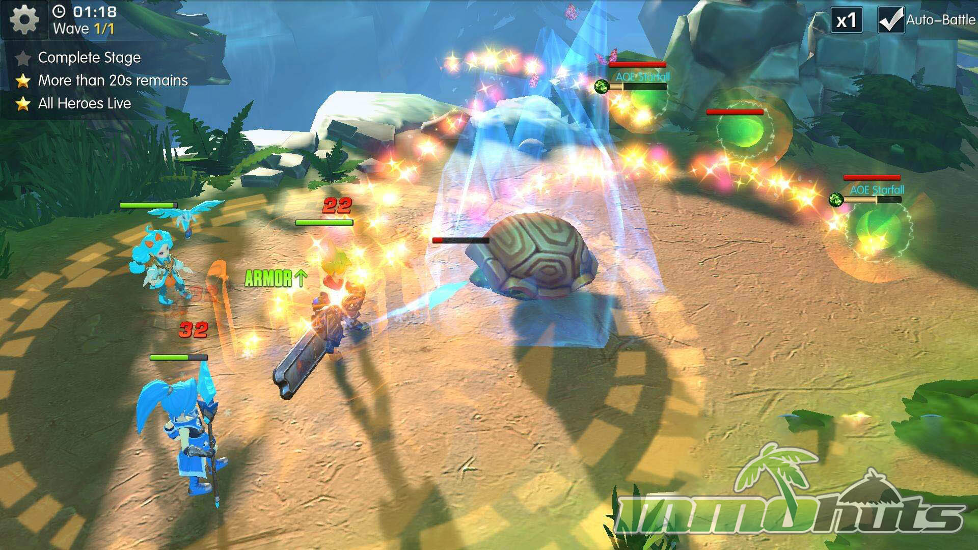 Autoplay is present, but it is limited to the easier mob stages and does not carry over into the raid fights. Once you clear a stage with a three-star rating, you can sweep it instantly by spending stamina, which reduces repetitive manual farming. Hero collection follows the familiar mobile gacha pattern, with 35+ heroes available and daily free pulls (five normal summons and one epic summon) encouraging steady roster growth over time.