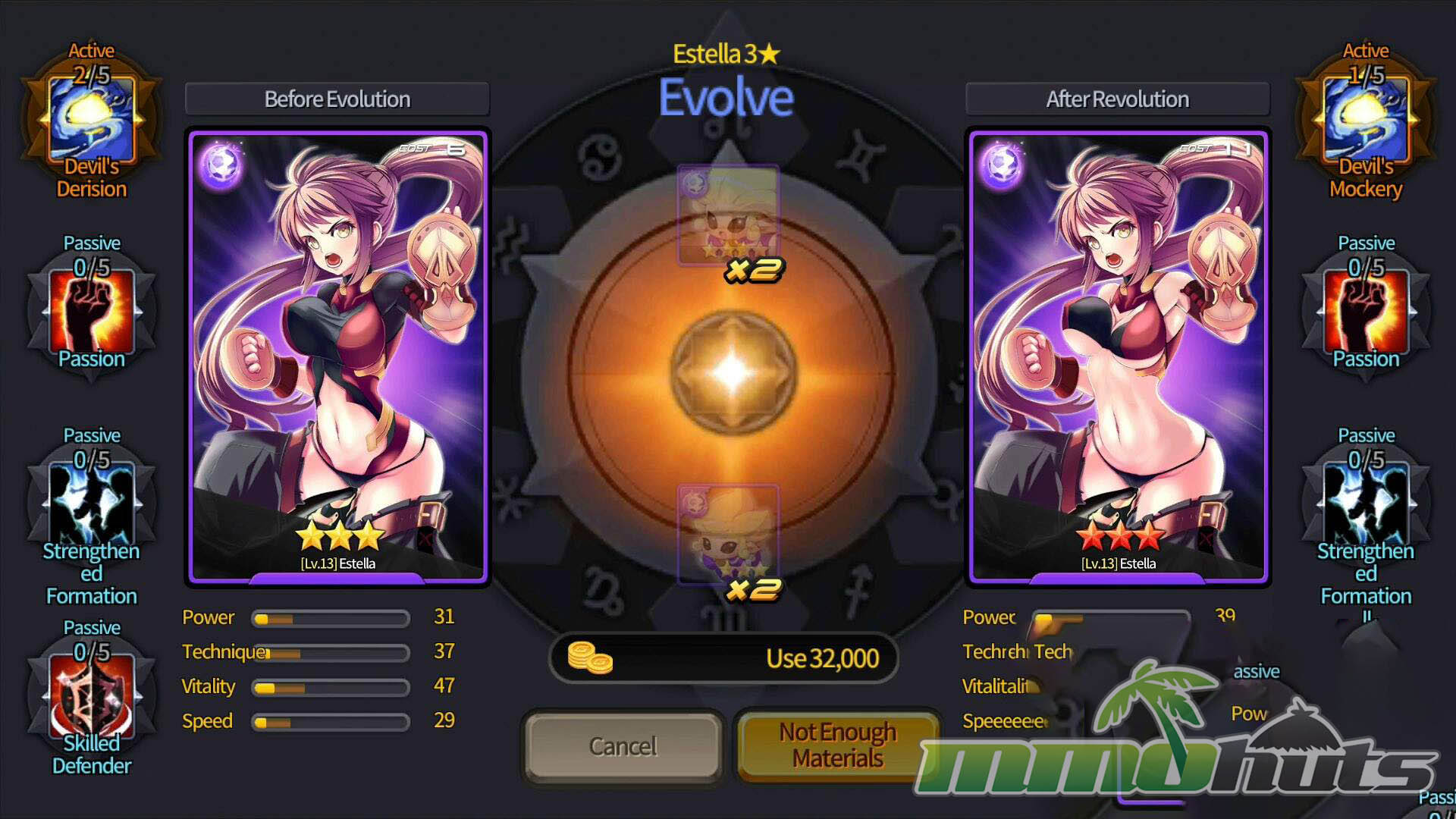 Progression is also tied to cost management. Each Hero has a Cost value and your team must fit under a Cost limit that rises as you level up, which forces tradeoffs and makes formation planning matter. Evolution requires Elementals of specific star levels plus gold (for example, evolving from 3 to 4 stars requires two 4-star Elementals, two 3-star Elementals, and 32,000 gold). Because Elementals are obtained through play and summons, upgrading a full lineup becomes a long-term project, and this is where the game’s farming reputation comes from.