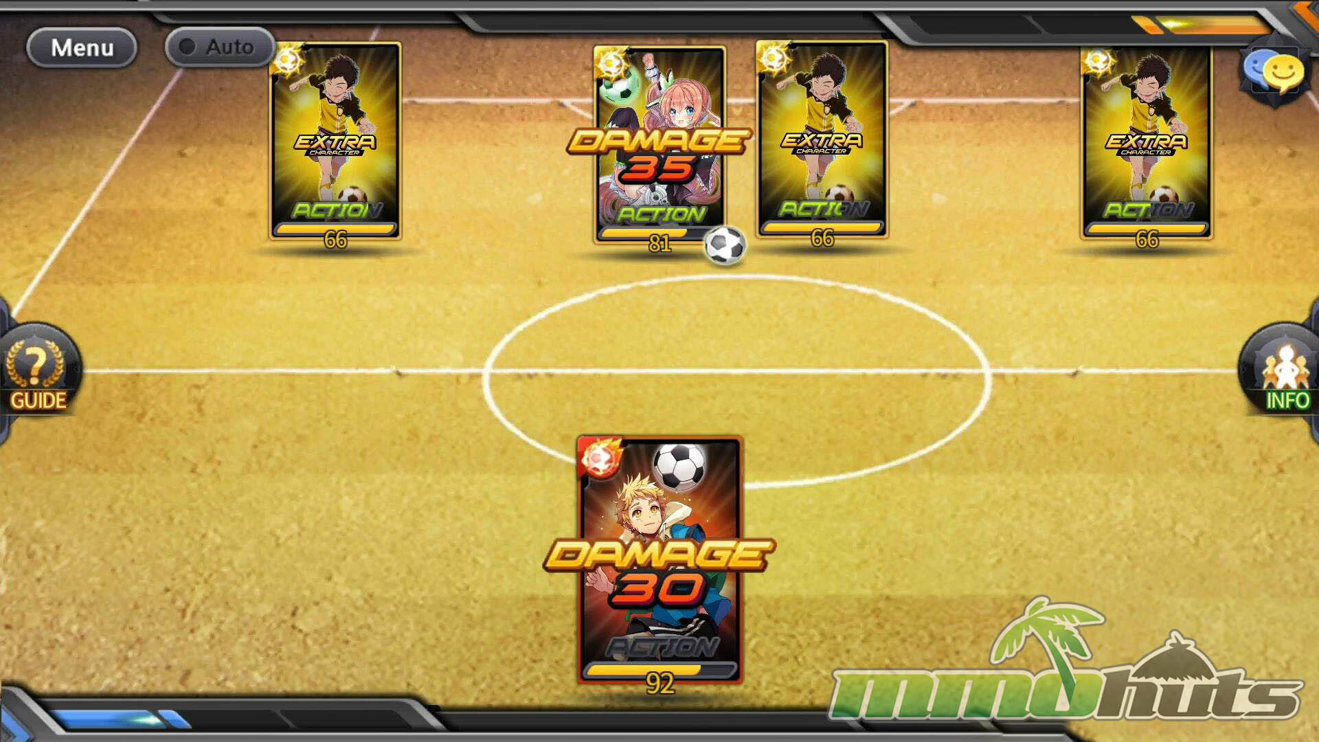 Soccer Spirits uses a formation of up to 10 Heroes split into front, middle, and back lines. The match revolves around who holds the ball and what you do with each turn. When you have possession, you typically choose between passing within a line, pushing through a direct matchup (penetration), using a skill, or taking a shot once you reach the enemy’s back line.