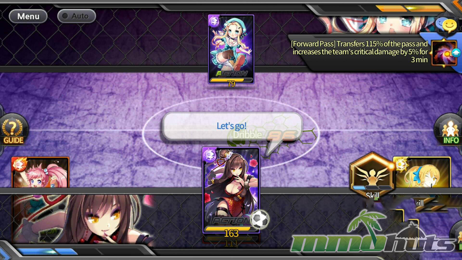 Soccer Spirits uses a formation of up to 10 Heroes split into front, middle, and back lines. The match revolves around who holds the ball and what you do with each turn. When you have possession, you typically choose between passing within a line, pushing through a direct matchup (penetration), using a skill, or taking a shot once you reach the enemy’s back line.