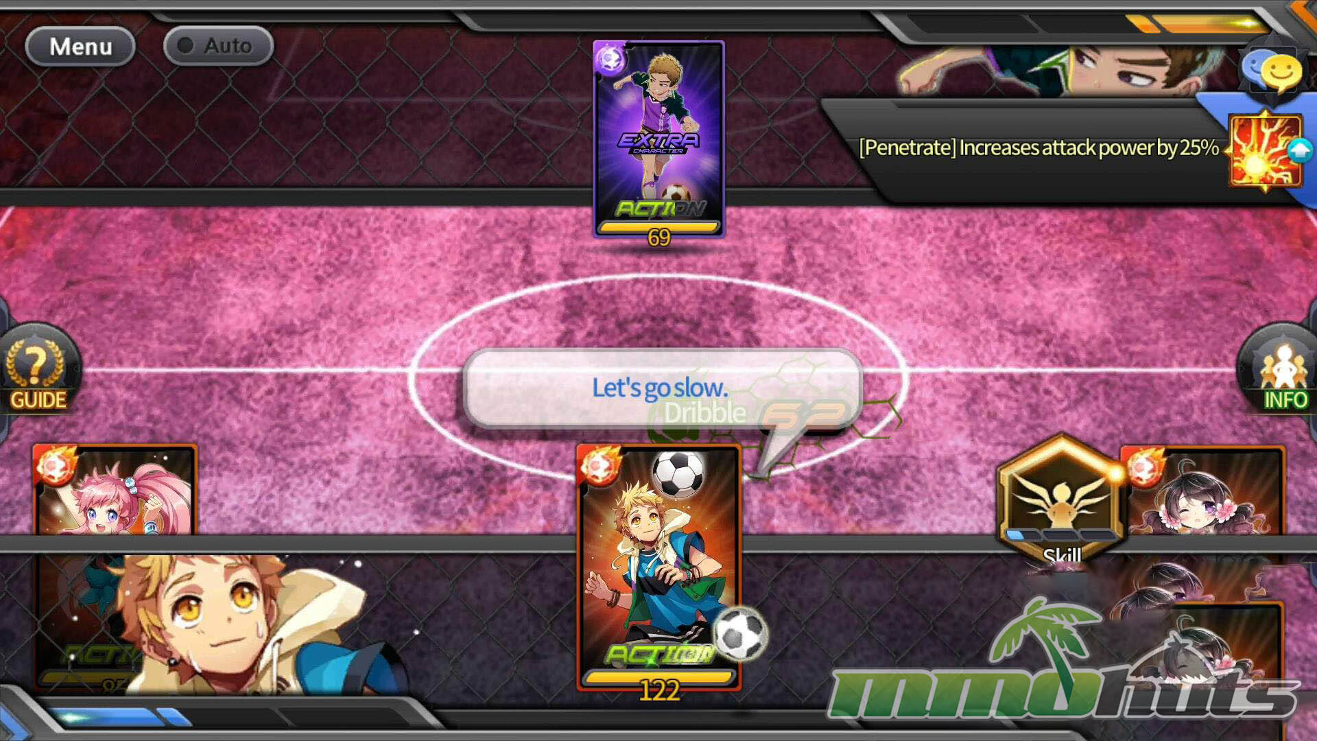 Soccer Spirits uses a formation of up to 10 Heroes split into front, middle, and back lines. The match revolves around who holds the ball and what you do with each turn. When you have possession, you typically choose between passing within a line, pushing through a direct matchup (penetration), using a skill, or taking a shot once you reach the enemy’s back line.