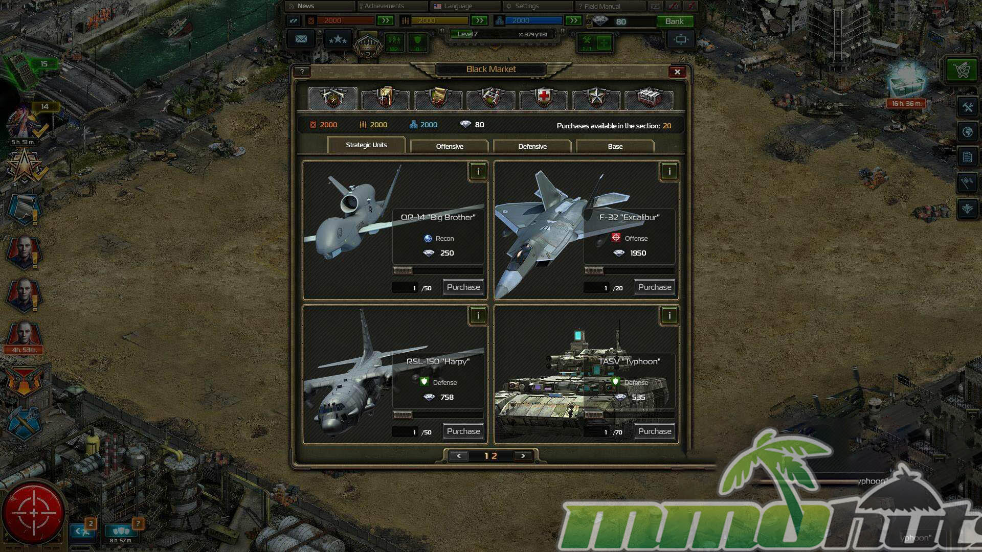 | Publisher: Plarium Playerbase: Medium Type: Browser Strategy Release Date: August 1, 2013 Pros: +Active community for the genre. +Memorable audio and voice work. +Modern military setting fits the gameplay. Cons: -Premium currency can translate into direct power. -Older isometric visuals will not appeal to everyone. |
